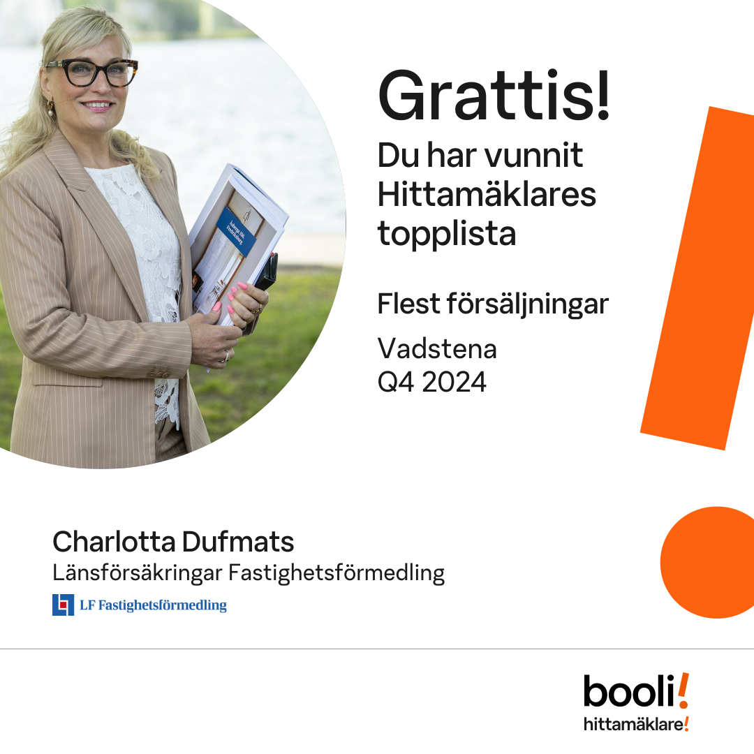 Statistik för publicerade bostäder, försäljningar och omdömen baseras på data från Booli och Hittamäklare. Statistiken för försäljningar avser inrapporterade och verifierade slutpriser från mäklare eller av Booli inhämtade och verifierade slutpriser. Statistiken för publicerade bostäder baseras på information som publicerats på Booli.se. Statistik för omdömen och rekommendationer baseras på omdömen från säljare som lämnats via Booli och Hittamäklare.