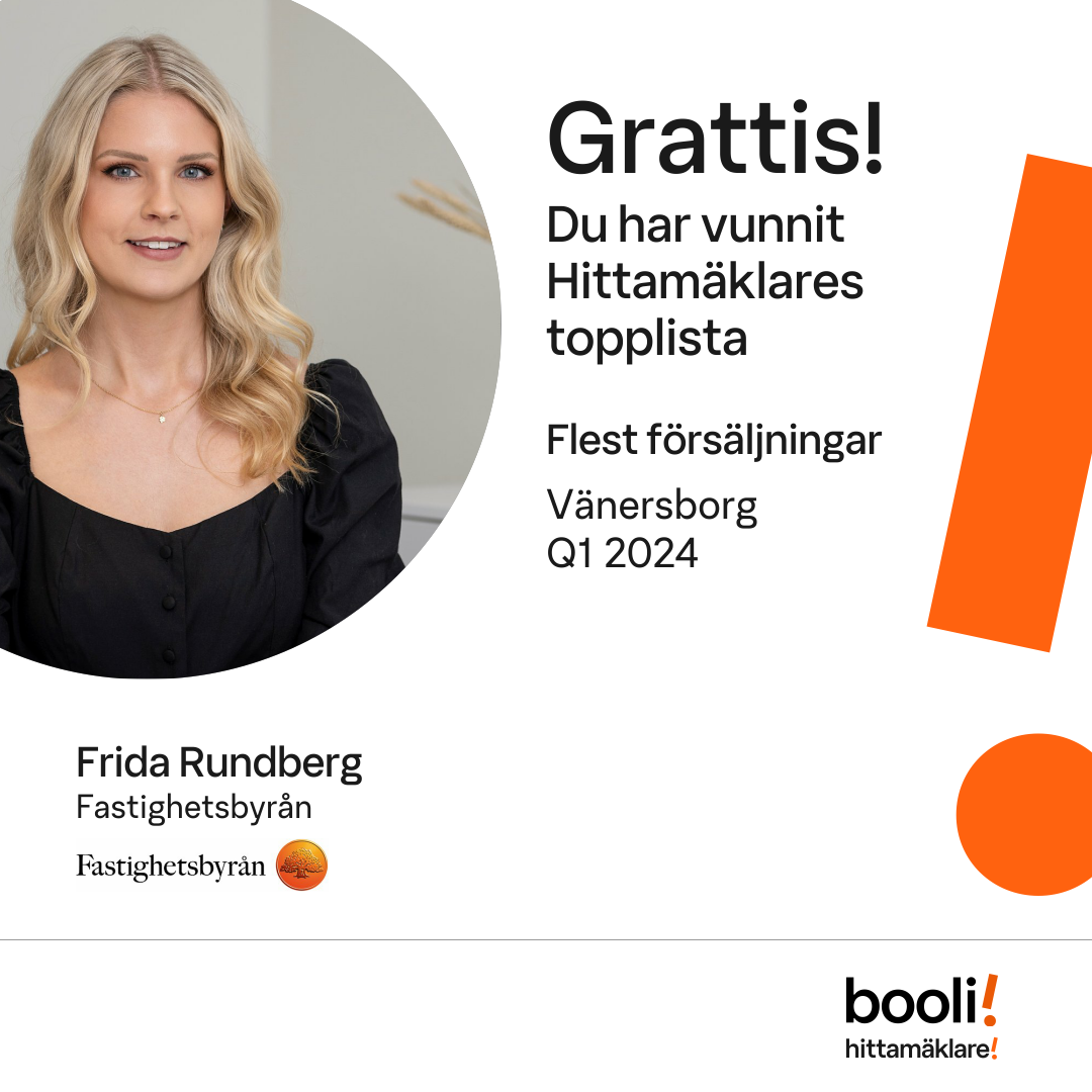 Statistik för publicerade bostäder, försäljningar och omdömen baseras på data från Booli och Hittamäklare. Statistiken för försäljningar avser inrapporterade och verifierade slutpriser från mäklare eller av Booli inhämtade och verifierade slutpriser. Statistiken för publicerade bostäder baseras på information som publicerats på Booli.se. Statistik för omdömen och rekommendationer baseras på omdömen från säljare som lämnats via Booli och Hittamäklare.