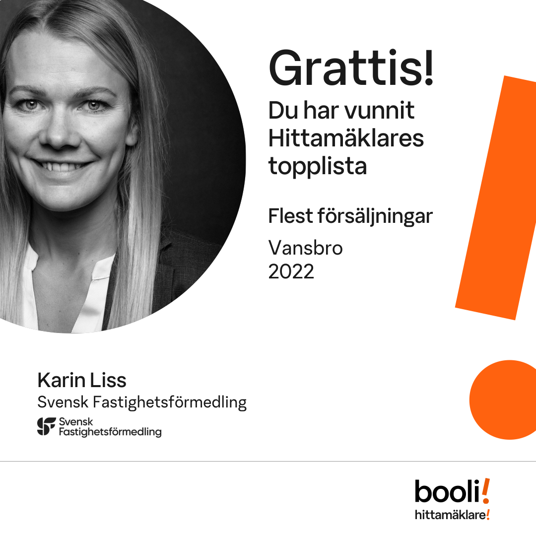 Statistik för publicerade bostäder, försäljningar och omdömen baseras på data från Booli och Hittamäklare. Statistiken för försäljningar avser inrapporterade och verifierade slutpriser från mäklare eller av Booli inhämtade och verifierade slutpriser. Statistiken för publicerade bostäder baseras på information som publicerats på Booli.se. Statistik för omdömen och rekommendationer baseras på omdömen från säljare som lämnats via Booli och Hittamäklare.