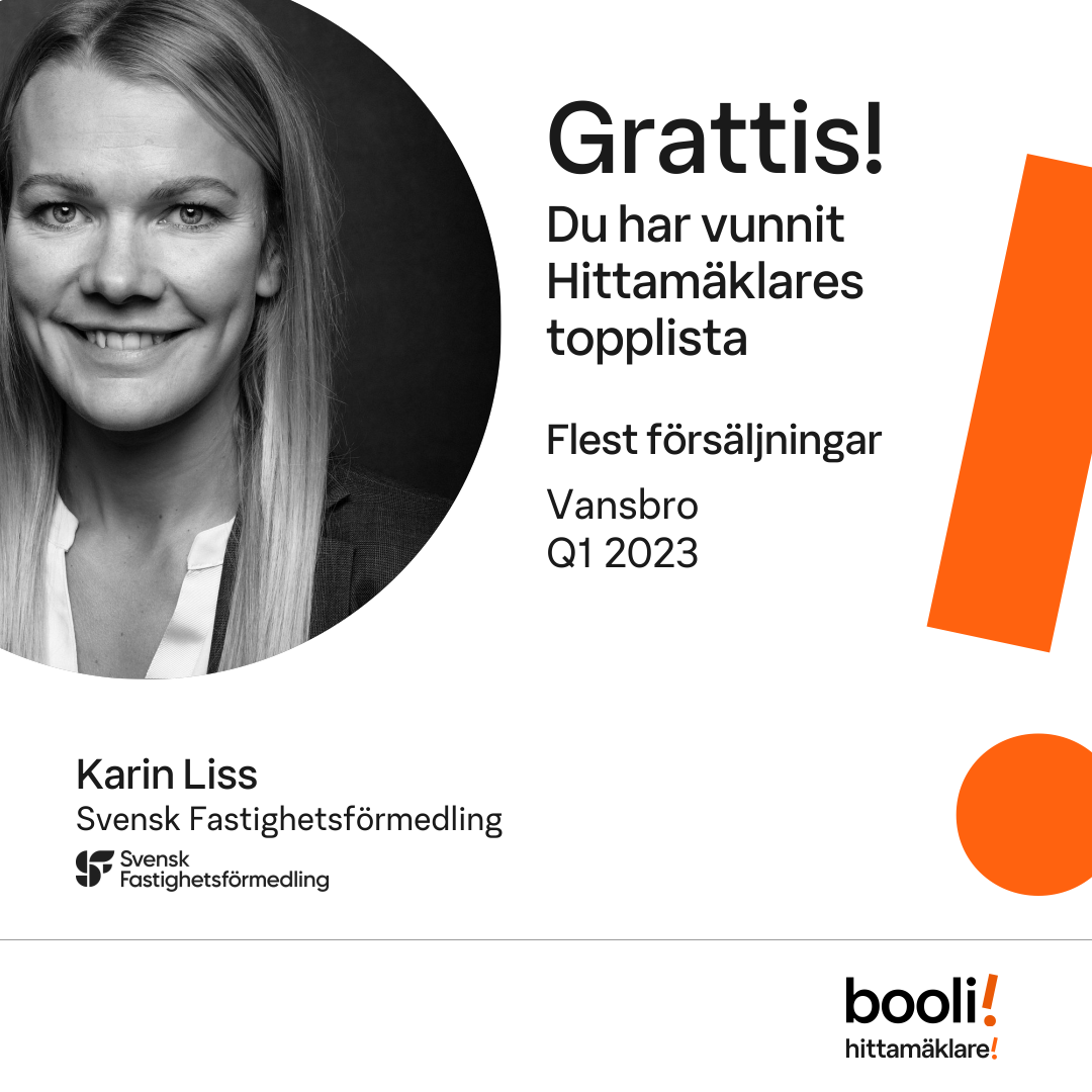 Statistik för publicerade bostäder, försäljningar och omdömen baseras på data från Booli och Hittamäklare. Statistiken för försäljningar avser inrapporterade och verifierade slutpriser från mäklare eller av Booli inhämtade och verifierade slutpriser. Statistiken för publicerade bostäder baseras på information som publicerats på Booli.se. Statistik för omdömen och rekommendationer baseras på omdömen från säljare som lämnats via Booli och Hittamäklare.