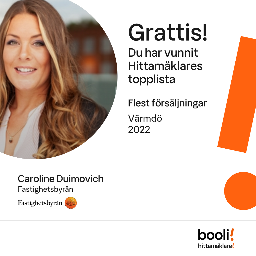 Statistik för publicerade bostäder, försäljningar och omdömen baseras på data från Booli och Hittamäklare. Statistiken för försäljningar avser inrapporterade och verifierade slutpriser från mäklare eller av Booli inhämtade och verifierade slutpriser. Statistiken för publicerade bostäder baseras på information som publicerats på Booli.se. Statistik för omdömen och rekommendationer baseras på omdömen från säljare som lämnats via Booli och Hittamäklare.