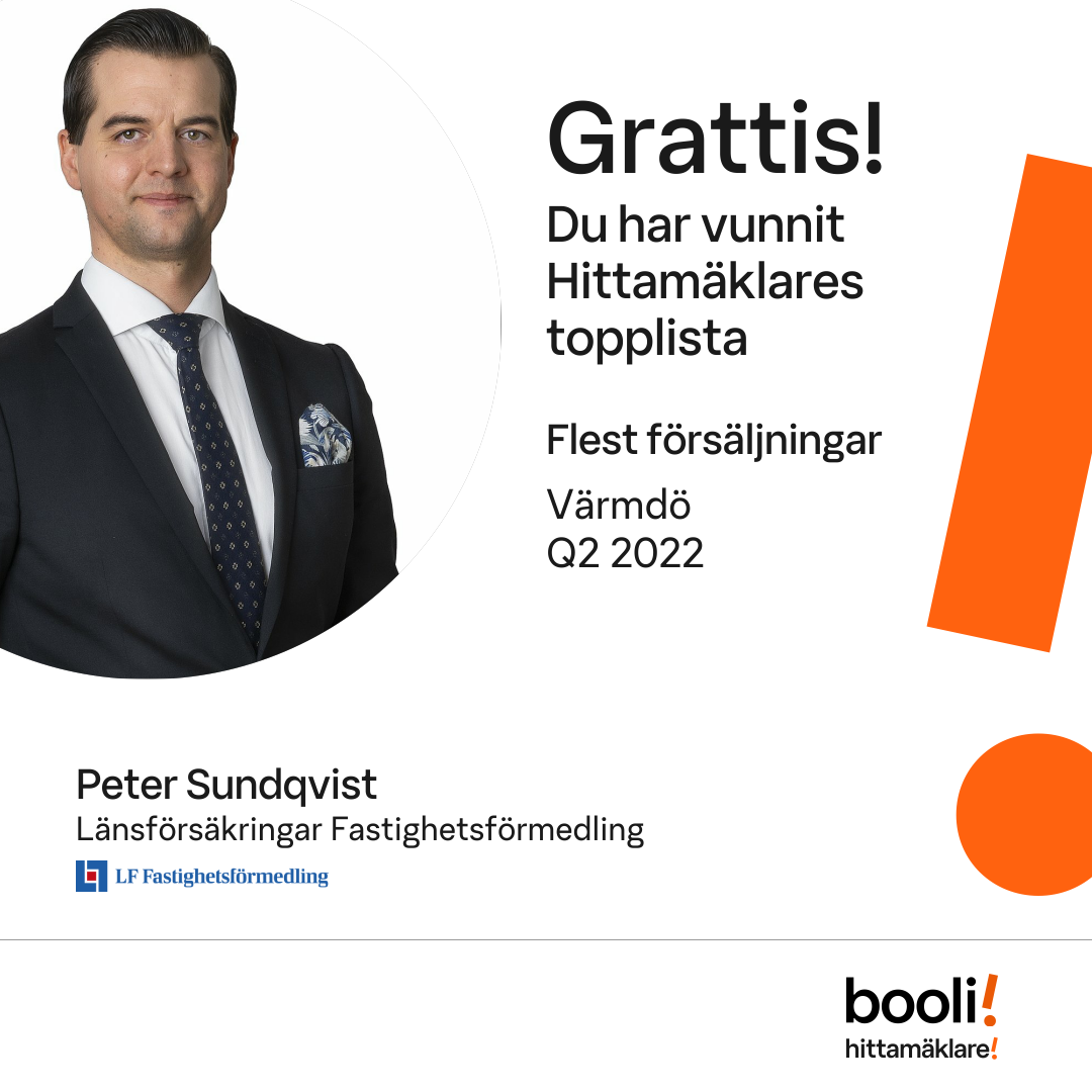 Statistik för publicerade bostäder, försäljningar och omdömen baseras på data från Booli och Hittamäklare. Statistiken för försäljningar avser inrapporterade och verifierade slutpriser från mäklare eller av Booli inhämtade och verifierade slutpriser. Statistiken för publicerade bostäder baseras på information som publicerats på Booli.se. Statistik för omdömen och rekommendationer baseras på omdömen från säljare som lämnats via Booli och Hittamäklare.