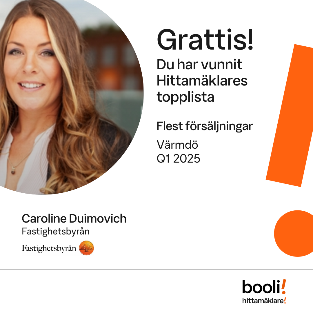 Statistik för publicerade bostäder, försäljningar och omdömen baseras på data från Booli och Hittamäklare. Statistiken för försäljningar avser inrapporterade och verifierade slutpriser från mäklare eller av Booli inhämtade och verifierade slutpriser. Statistiken för publicerade bostäder baseras på information som publicerats på Booli.se. Statistik för omdömen och rekommendationer baseras på omdömen från säljare som lämnats via Booli och Hittamäklare.