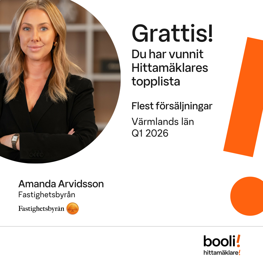 Statistik för publicerade bostäder, försäljningar och omdömen baseras på data från Booli. Statistiken för försäljningar avser inrapporterade och verifierade slutpriser från mäklare eller av Booli inhämtade och verifierade slutpriser. Statistiken för publicerade bostäder baseras på information som publicerats på Booli.se. Statistik för omdömen och rekommendationer baseras på omdömen från säljare som lämnats via Booli.