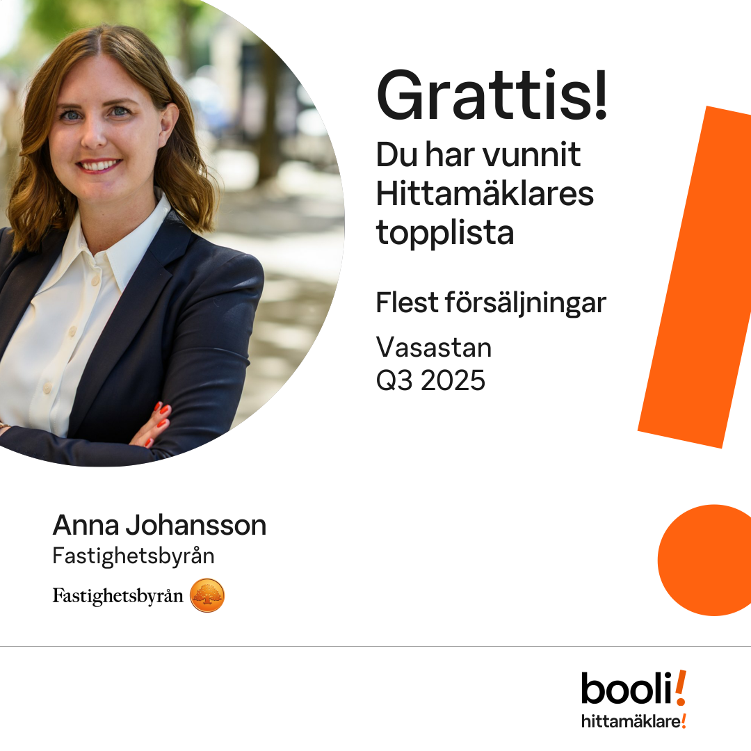 Statistik för publicerade bostäder, försäljningar och omdömen baseras på data från Booli och Hittamäklare. Statistiken för försäljningar avser inrapporterade och verifierade slutpriser från mäklare eller av Booli inhämtade och verifierade slutpriser. Statistiken för publicerade bostäder baseras på information som publicerats på Booli.se. Statistik för omdömen och rekommendationer baseras på omdömen från säljare som lämnats via Booli och Hittamäklare.