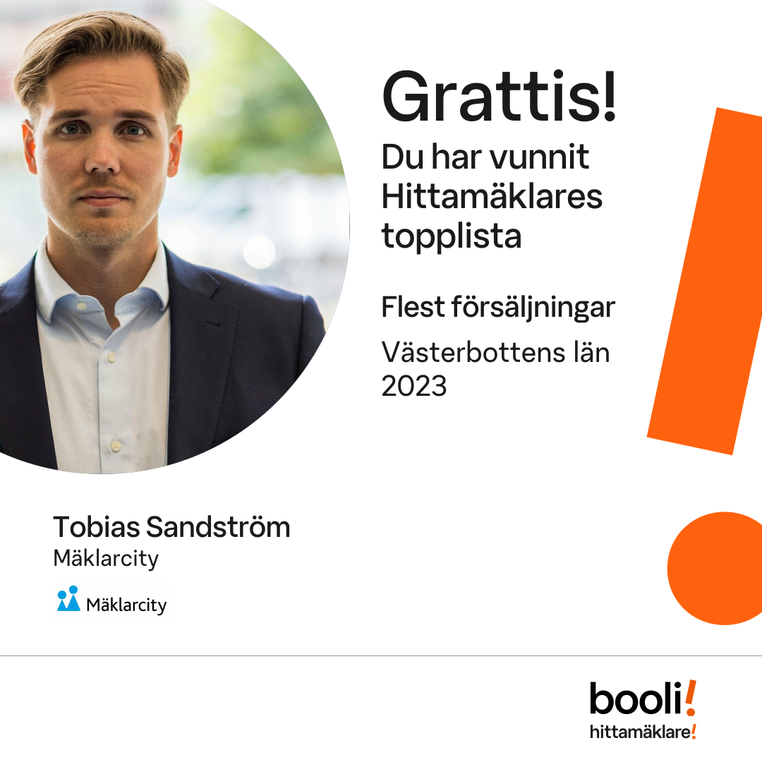Statistik för publicerade bostäder, försäljningar och omdömen baseras på data från Booli och Hittamäklare. Statistiken för försäljningar avser inrapporterade och verifierade slutpriser från mäklare eller av Booli inhämtade och verifierade slutpriser. Statistiken för publicerade bostäder baseras på information som publicerats på Booli.se. Statistik för omdömen och rekommendationer baseras på omdömen från säljare som lämnats via Booli och Hittamäklare.