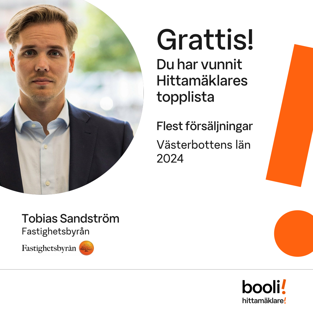 Statistik för publicerade bostäder, försäljningar och omdömen baseras på data från Booli och Hittamäklare. Statistiken för försäljningar avser inrapporterade och verifierade slutpriser från mäklare eller av Booli inhämtade och verifierade slutpriser. Statistiken för publicerade bostäder baseras på information som publicerats på Booli.se. Statistik för omdömen och rekommendationer baseras på omdömen från säljare som lämnats via Booli och Hittamäklare.