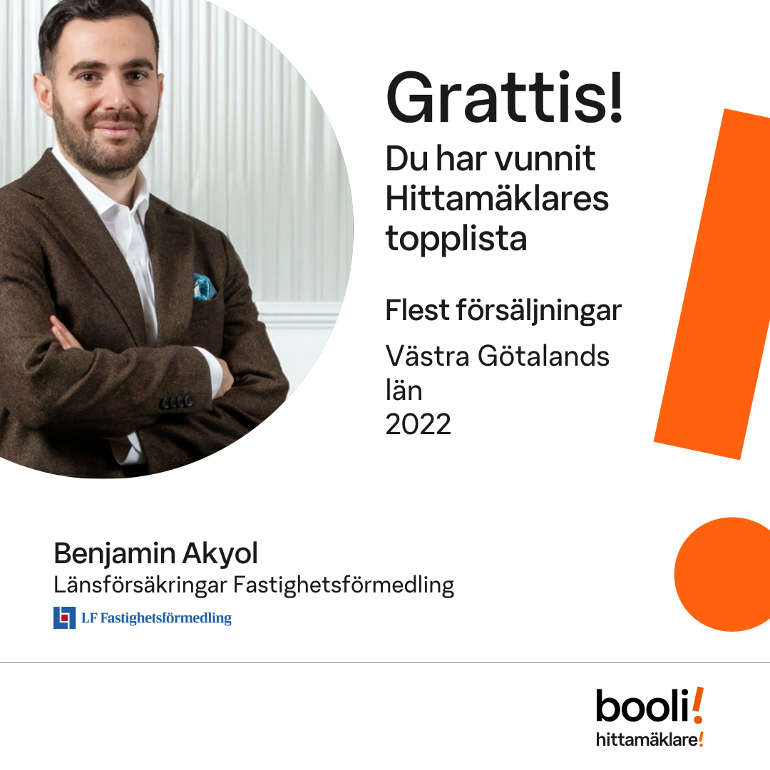 Statistik för publicerade bostäder, försäljningar och omdömen baseras på data från Booli och Hittamäklare. Statistiken för försäljningar avser inrapporterade och verifierade slutpriser från mäklare eller av Booli inhämtade och verifierade slutpriser. Statistiken för publicerade bostäder baseras på information som publicerats på Booli.se. Statistik för omdömen och rekommendationer baseras på omdömen från säljare som lämnats via Booli och Hittamäklare.