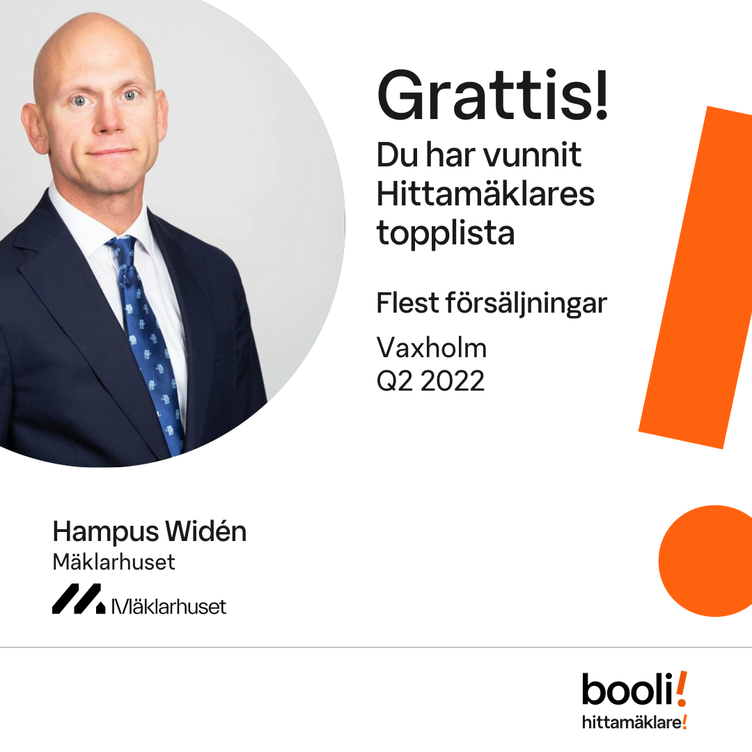 Statistik för publicerade bostäder, försäljningar och omdömen baseras på data från Booli och Hittamäklare. Statistiken för försäljningar avser inrapporterade och verifierade slutpriser från mäklare eller av Booli inhämtade och verifierade slutpriser. Statistiken för publicerade bostäder baseras på information som publicerats på Booli.se. Statistik för omdömen och rekommendationer baseras på omdömen från säljare som lämnats via Booli och Hittamäklare.