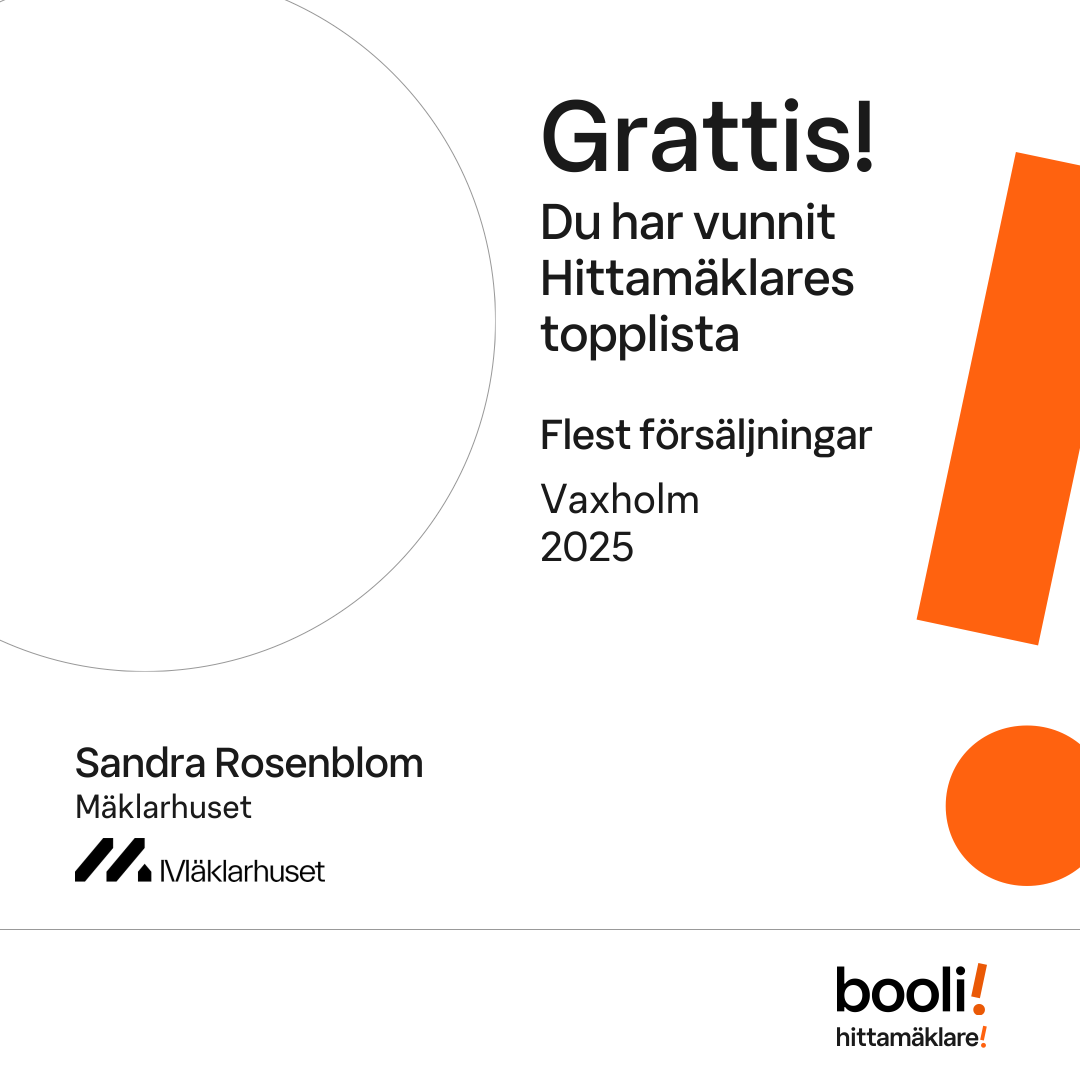 Statistik för publicerade bostäder, försäljningar och omdömen baseras på data från Booli och Hittamäklare. Statistiken för försäljningar avser inrapporterade och verifierade slutpriser från mäklare eller av Booli inhämtade och verifierade slutpriser. Statistiken för publicerade bostäder baseras på information som publicerats på Booli.se. Statistik för omdömen och rekommendationer baseras på omdömen från säljare som lämnats via Booli och Hittamäklare.