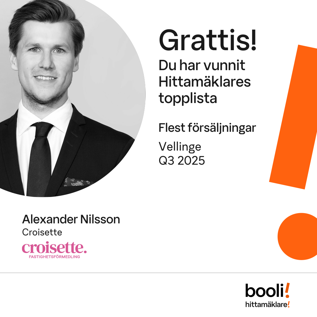 Statistik för publicerade bostäder, försäljningar och omdömen baseras på data från Booli och Hittamäklare. Statistiken för försäljningar avser inrapporterade och verifierade slutpriser från mäklare eller av Booli inhämtade och verifierade slutpriser. Statistiken för publicerade bostäder baseras på information som publicerats på Booli.se. Statistik för omdömen och rekommendationer baseras på omdömen från säljare som lämnats via Booli och Hittamäklare.