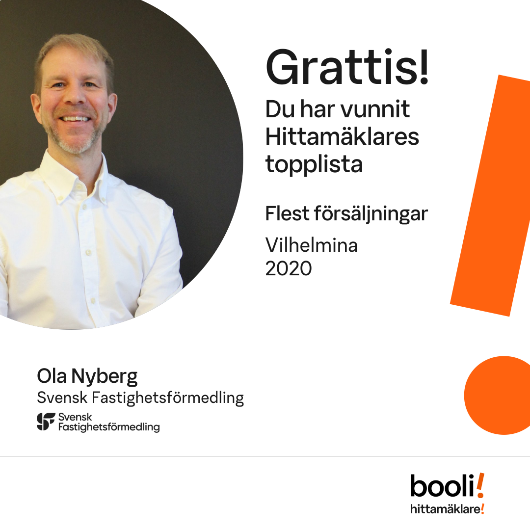 Statistik för publicerade bostäder, försäljningar och omdömen baseras på data från Booli och Hittamäklare. Statistiken för försäljningar avser inrapporterade och verifierade slutpriser från mäklare eller av Booli inhämtade och verifierade slutpriser. Statistiken för publicerade bostäder baseras på information som publicerats på Booli.se. Statistik för omdömen och rekommendationer baseras på omdömen från säljare som lämnats via Booli och Hittamäklare.
