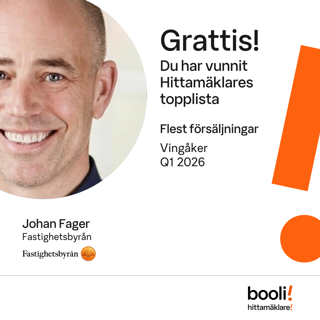 Statistik för publicerade bostäder, försäljningar och omdömen baseras på data från Booli. Statistiken för försäljningar avser inrapporterade och verifierade slutpriser från mäklare eller av Booli inhämtade och verifierade slutpriser. Statistiken för publicerade bostäder baseras på information som publicerats på Booli.se. Statistik för omdömen och rekommendationer baseras på omdömen från säljare som lämnats via Booli.