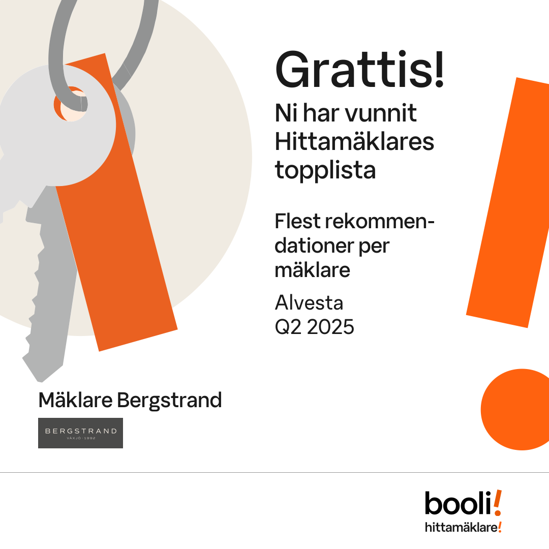 Statistik för publicerade bostäder, försäljningar och omdömen baseras på data från Booli och Hittamäklare. Statistiken för försäljningar avser inrapporterade och verifierade slutpriser från mäklare eller av Booli inhämtade och verifierade slutpriser. Statistiken för publicerade bostäder baseras på information som publicerats på Booli.se. Statistik för omdömen och rekommendationer baseras på omdömen från säljare som lämnats via Booli och Hittamäklare.