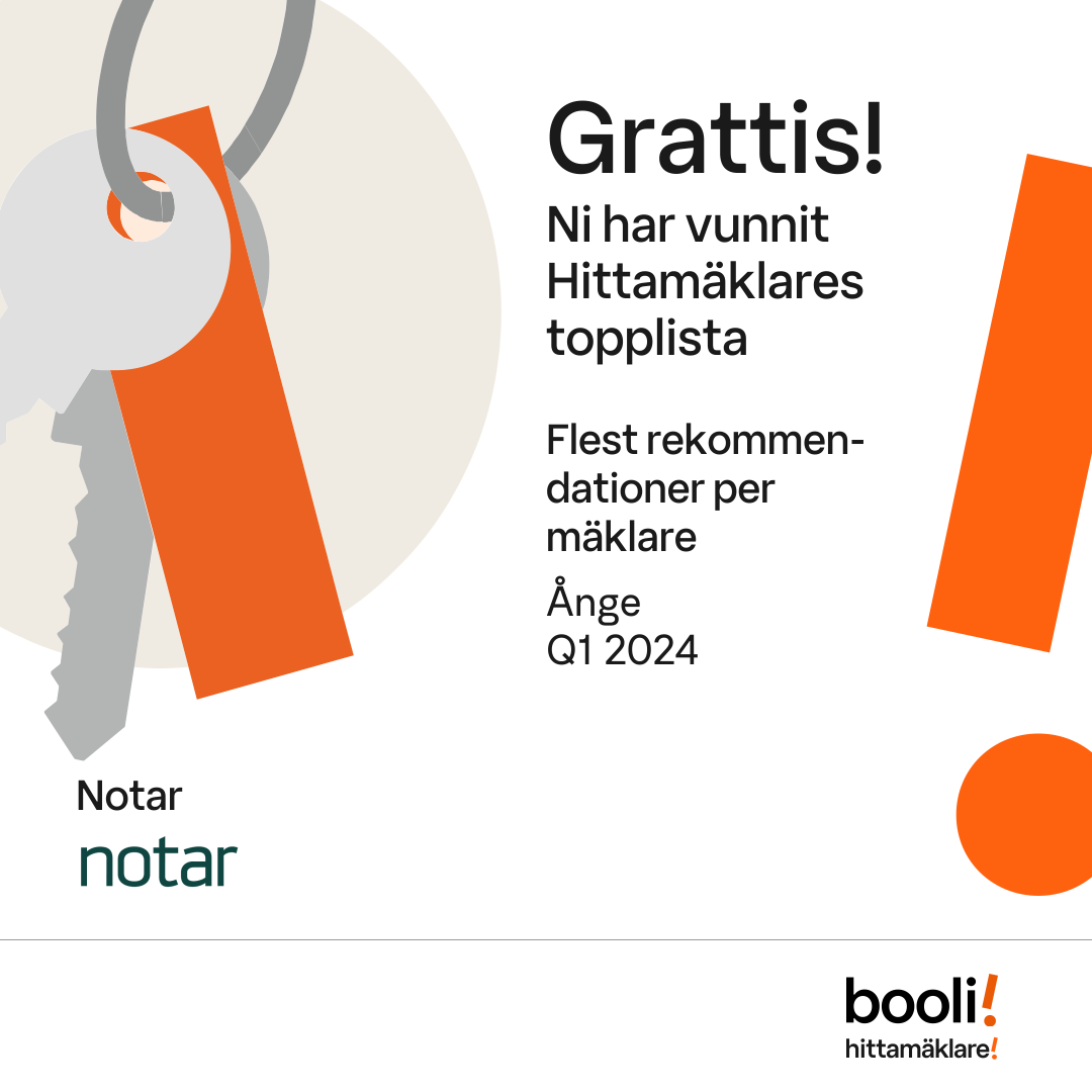 Statistik för publicerade bostäder, försäljningar och omdömen baseras på data från Booli och Hittamäklare. Statistiken för försäljningar avser inrapporterade och verifierade slutpriser från mäklare eller av Booli inhämtade och verifierade slutpriser. Statistiken för publicerade bostäder baseras på information som publicerats på Booli.se. Statistik för omdömen och rekommendationer baseras på omdömen från säljare som lämnats via Booli och Hittamäklare.