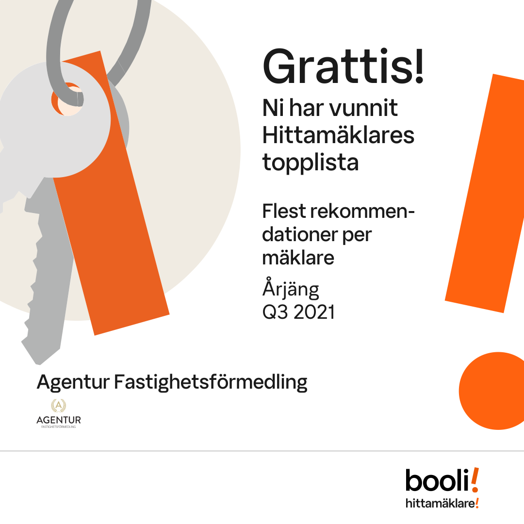 Statistik för publicerade bostäder, försäljningar och omdömen baseras på data från Booli och Hittamäklare. Statistiken för försäljningar avser inrapporterade och verifierade slutpriser från mäklare eller av Booli inhämtade och verifierade slutpriser. Statistiken för publicerade bostäder baseras på information som publicerats på Booli.se. Statistik för omdömen och rekommendationer baseras på omdömen från säljare som lämnats via Booli och Hittamäklare.