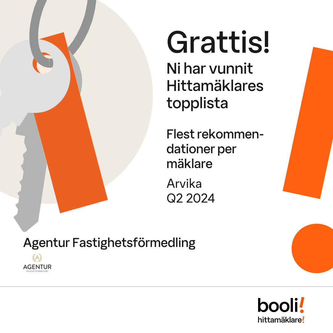 Statistik för publicerade bostäder, försäljningar och omdömen baseras på data från Booli och Hittamäklare. Statistiken för försäljningar avser inrapporterade och verifierade slutpriser från mäklare eller av Booli inhämtade och verifierade slutpriser. Statistiken för publicerade bostäder baseras på information som publicerats på Booli.se. Statistik för omdömen och rekommendationer baseras på omdömen från säljare som lämnats via Booli och Hittamäklare.