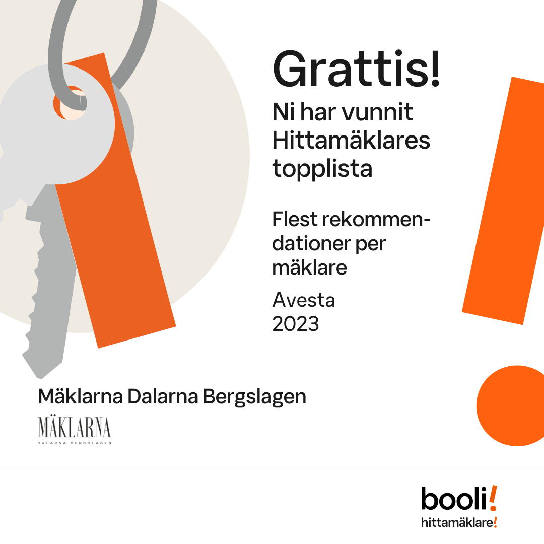Statistik för publicerade bostäder, försäljningar och omdömen baseras på data från Booli och Hittamäklare. Statistiken för försäljningar avser inrapporterade och verifierade slutpriser från mäklare eller av Booli inhämtade och verifierade slutpriser. Statistiken för publicerade bostäder baseras på information som publicerats på Booli.se. Statistik för omdömen och rekommendationer baseras på omdömen från säljare som lämnats via Booli och Hittamäklare.