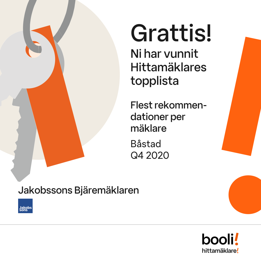 Statistik för publicerade bostäder, försäljningar och omdömen baseras på data från Booli och Hittamäklare. Statistiken för försäljningar avser inrapporterade och verifierade slutpriser från mäklare eller av Booli inhämtade och verifierade slutpriser. Statistiken för publicerade bostäder baseras på information som publicerats på Booli.se. Statistik för omdömen och rekommendationer baseras på omdömen från säljare som lämnats via Booli och Hittamäklare.