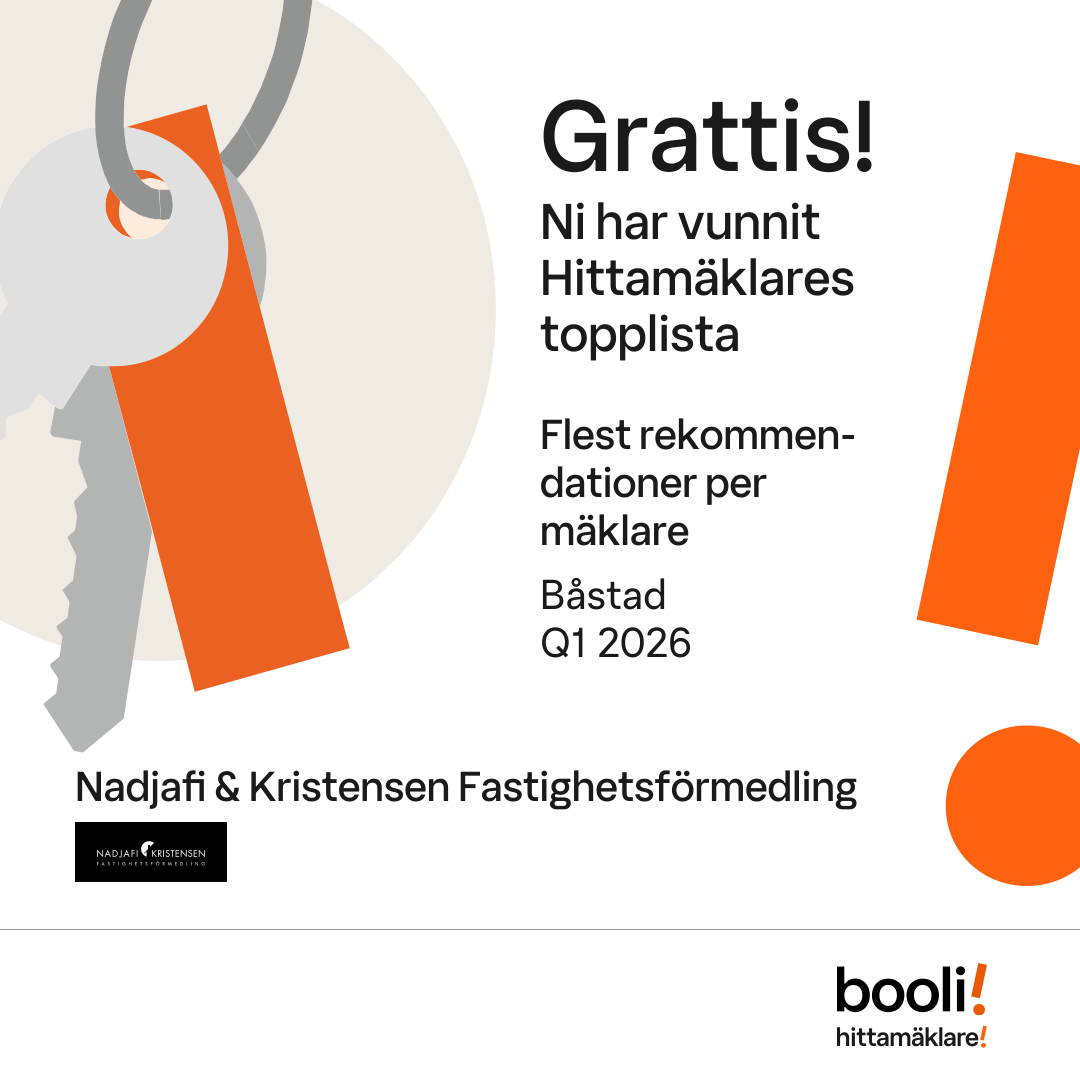 Statistik för publicerade bostäder, försäljningar och omdömen baseras på data från Booli. Statistiken för försäljningar avser inrapporterade och verifierade slutpriser från mäklare eller av Booli inhämtade och verifierade slutpriser. Statistiken för publicerade bostäder baseras på information som publicerats på Booli.se. Statistik för omdömen och rekommendationer baseras på omdömen från säljare som lämnats via Booli.