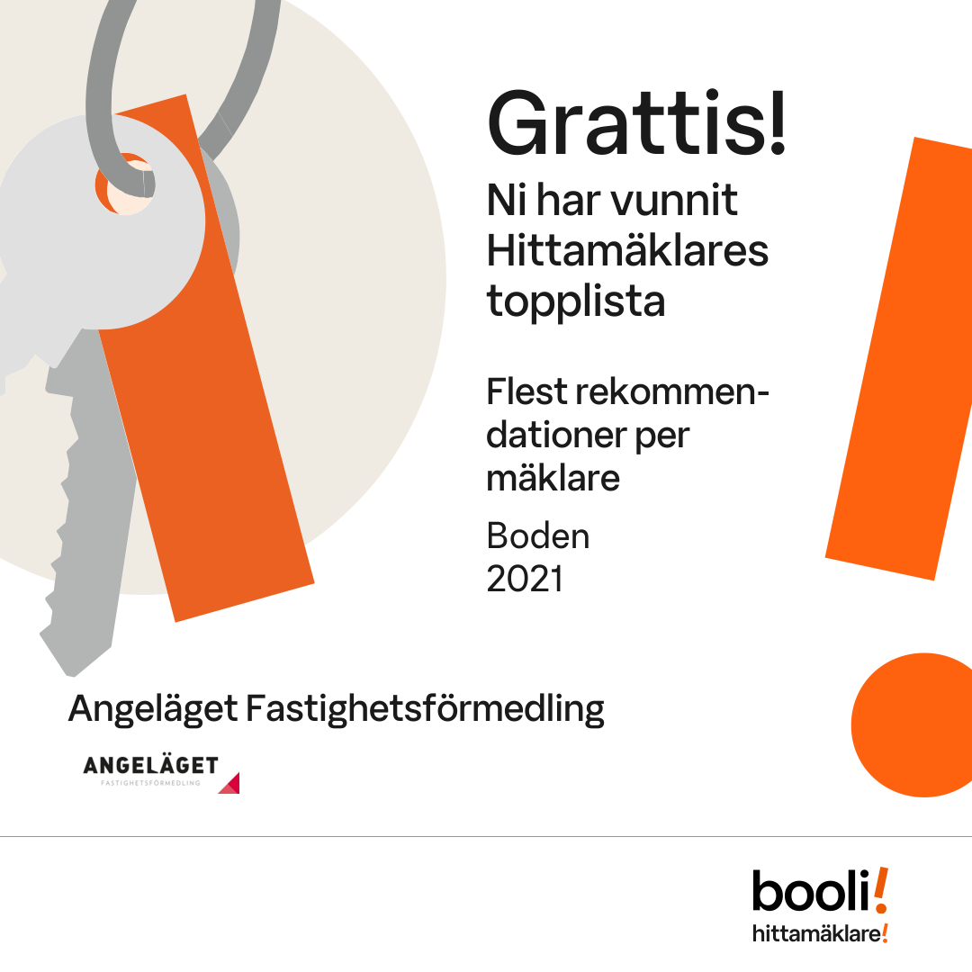 Statistik för publicerade bostäder, försäljningar och omdömen baseras på data från Booli och Hittamäklare. Statistiken för försäljningar avser inrapporterade och verifierade slutpriser från mäklare eller av Booli inhämtade och verifierade slutpriser. Statistiken för publicerade bostäder baseras på information som publicerats på Booli.se. Statistik för omdömen och rekommendationer baseras på omdömen från säljare som lämnats via Booli och Hittamäklare.