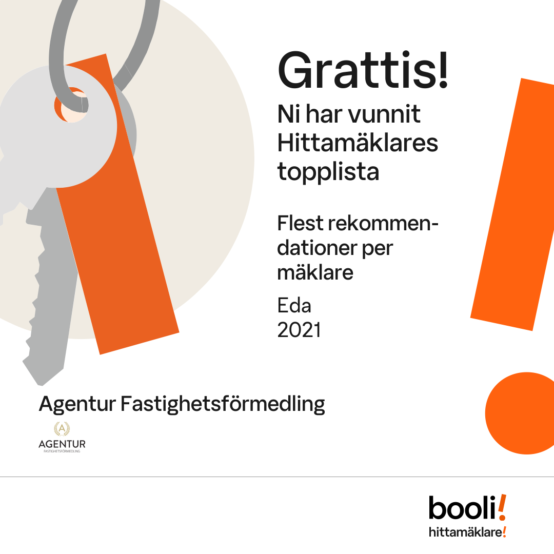 Statistik för publicerade bostäder, försäljningar och omdömen baseras på data från Booli och Hittamäklare. Statistiken för försäljningar avser inrapporterade och verifierade slutpriser från mäklare eller av Booli inhämtade och verifierade slutpriser. Statistiken för publicerade bostäder baseras på information som publicerats på Booli.se. Statistik för omdömen och rekommendationer baseras på omdömen från säljare som lämnats via Booli och Hittamäklare.