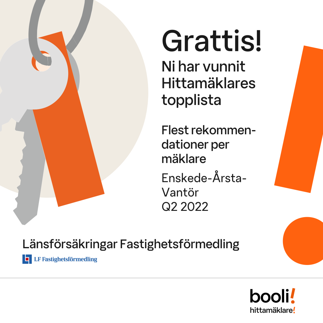 Statistik för publicerade bostäder, försäljningar och omdömen baseras på data från Booli och Hittamäklare. Statistiken för försäljningar avser inrapporterade och verifierade slutpriser från mäklare eller av Booli inhämtade och verifierade slutpriser. Statistiken för publicerade bostäder baseras på information som publicerats på Booli.se. Statistik för omdömen och rekommendationer baseras på omdömen från säljare som lämnats via Booli och Hittamäklare.