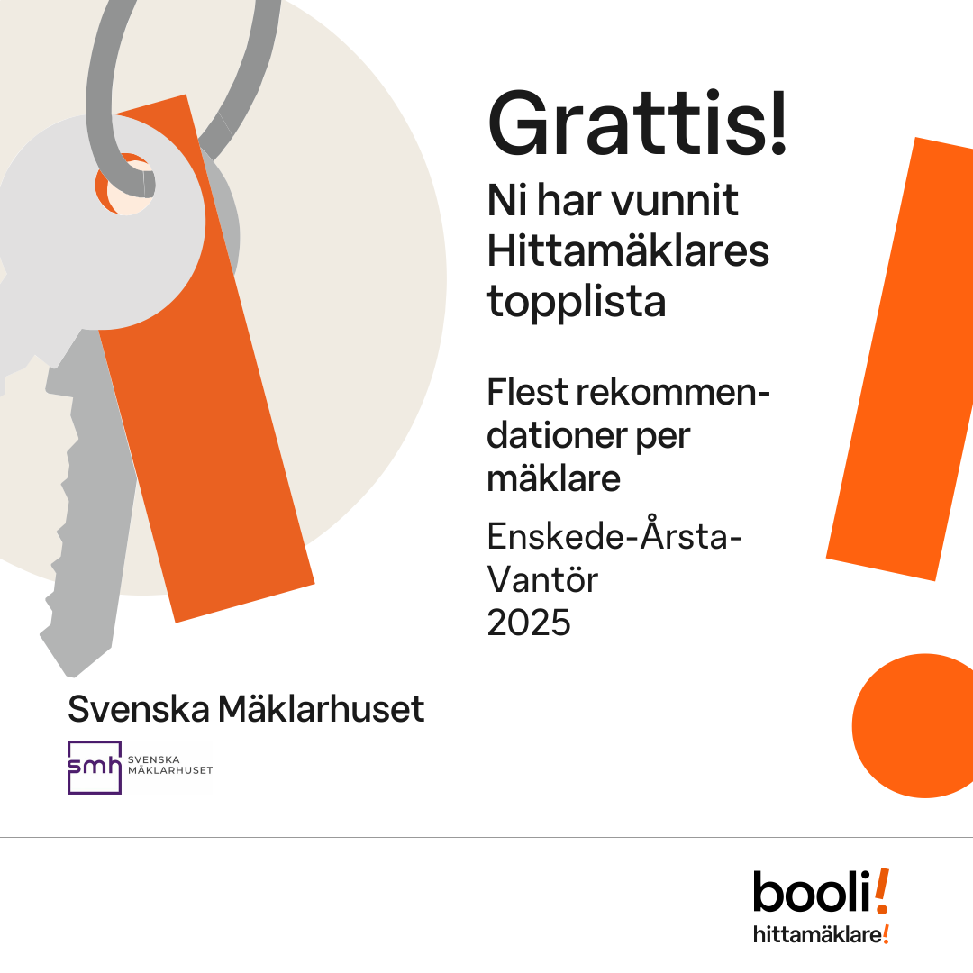Statistik för publicerade bostäder, försäljningar och omdömen baseras på data från Booli och Hittamäklare. Statistiken för försäljningar avser inrapporterade och verifierade slutpriser från mäklare eller av Booli inhämtade och verifierade slutpriser. Statistiken för publicerade bostäder baseras på information som publicerats på Booli.se. Statistik för omdömen och rekommendationer baseras på omdömen från säljare som lämnats via Booli och Hittamäklare.