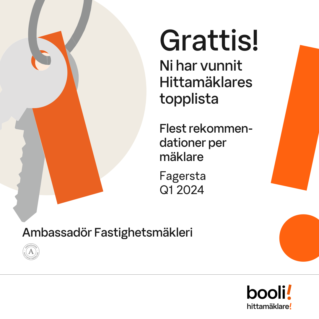 Statistik för publicerade bostäder, försäljningar och omdömen baseras på data från Booli. Statistiken för försäljningar avser inrapporterade och verifierade slutpriser från mäklare eller av Booli inhämtade och verifierade slutpriser. Statistiken för publicerade bostäder baseras på information som publicerats på Booli.se. Statistik för omdömen och rekommendationer baseras på omdömen från säljare som lämnats via Booli.