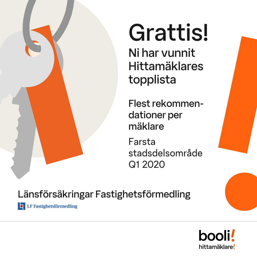 Statistik för publicerade bostäder, försäljningar och omdömen baseras på data från Booli och Hittamäklare. Statistiken för försäljningar avser inrapporterade och verifierade slutpriser från mäklare eller av Booli inhämtade och verifierade slutpriser. Statistiken för publicerade bostäder baseras på information som publicerats på Booli.se. Statistik för omdömen och rekommendationer baseras på omdömen från säljare som lämnats via Booli och Hittamäklare.