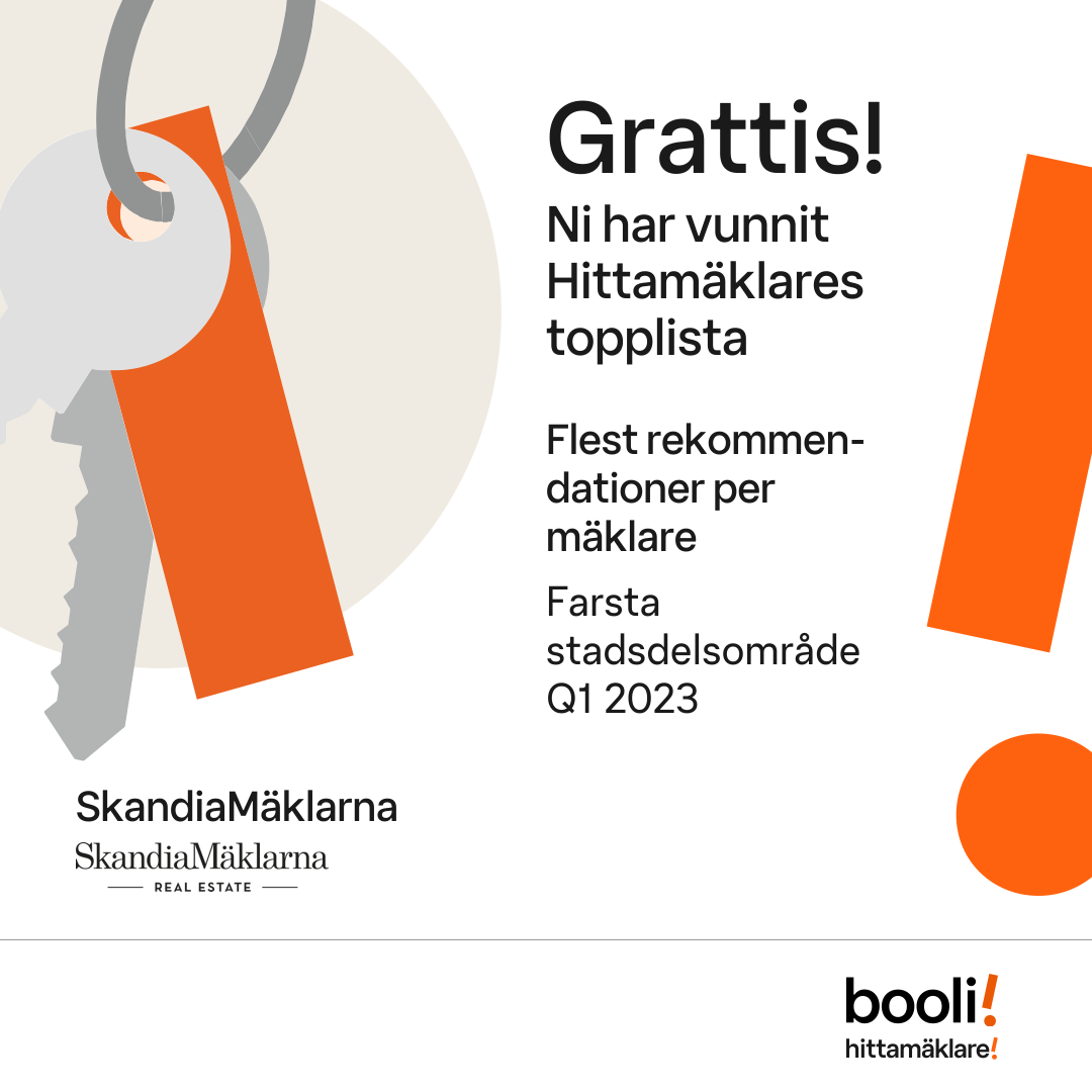 Statistik för publicerade bostäder, försäljningar och omdömen baseras på data från Booli och Hittamäklare. Statistiken för försäljningar avser inrapporterade och verifierade slutpriser från mäklare eller av Booli inhämtade och verifierade slutpriser. Statistiken för publicerade bostäder baseras på information som publicerats på Booli.se. Statistik för omdömen och rekommendationer baseras på omdömen från säljare som lämnats via Booli och Hittamäklare.