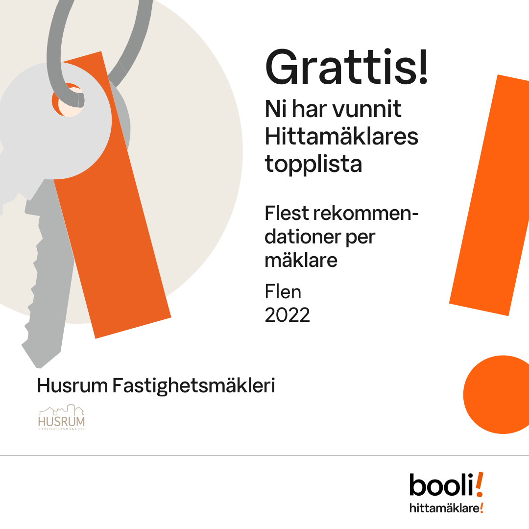 Statistik för publicerade bostäder, försäljningar och omdömen baseras på data från Booli och Hittamäklare. Statistiken för försäljningar avser inrapporterade och verifierade slutpriser från mäklare eller av Booli inhämtade och verifierade slutpriser. Statistiken för publicerade bostäder baseras på information som publicerats på Booli.se. Statistik för omdömen och rekommendationer baseras på omdömen från säljare som lämnats via Booli och Hittamäklare.