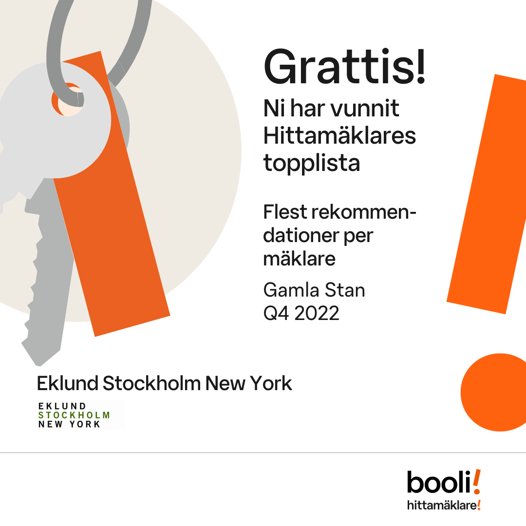 Statistik för publicerade bostäder, försäljningar och omdömen baseras på data från Booli och Hittamäklare. Statistiken för försäljningar avser inrapporterade och verifierade slutpriser från mäklare eller av Booli inhämtade och verifierade slutpriser. Statistiken för publicerade bostäder baseras på information som publicerats på Booli.se. Statistik för omdömen och rekommendationer baseras på omdömen från säljare som lämnats via Booli och Hittamäklare.