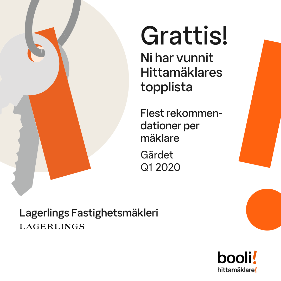 Statistik för publicerade bostäder, försäljningar och omdömen baseras på data från Booli och Hittamäklare. Statistiken för försäljningar avser inrapporterade och verifierade slutpriser från mäklare eller av Booli inhämtade och verifierade slutpriser. Statistiken för publicerade bostäder baseras på information som publicerats på Booli.se. Statistik för omdömen och rekommendationer baseras på omdömen från säljare som lämnats via Booli och Hittamäklare.