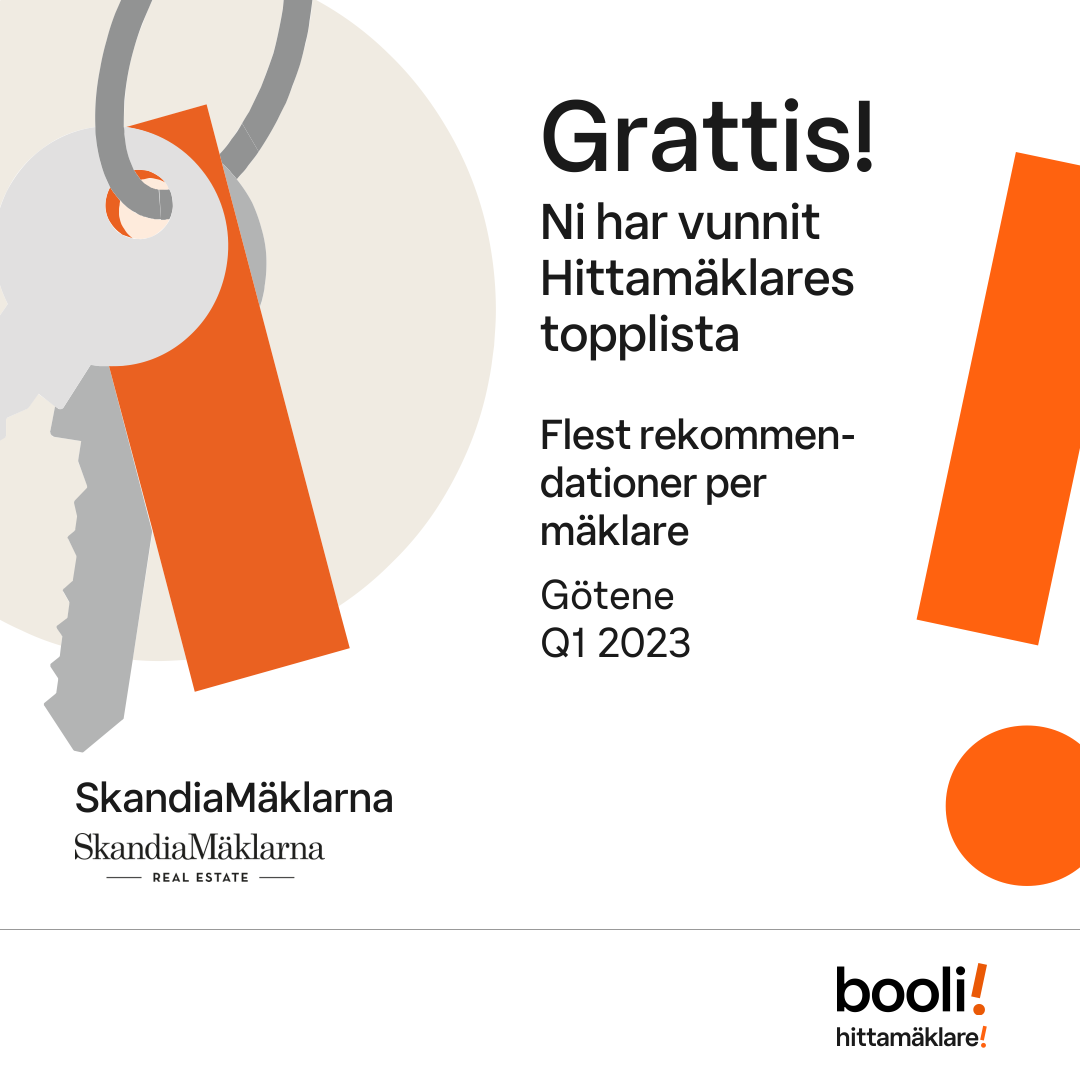 Statistik för publicerade bostäder, försäljningar och omdömen baseras på data från Booli och Hittamäklare. Statistiken för försäljningar avser inrapporterade och verifierade slutpriser från mäklare eller av Booli inhämtade och verifierade slutpriser. Statistiken för publicerade bostäder baseras på information som publicerats på Booli.se. Statistik för omdömen och rekommendationer baseras på omdömen från säljare som lämnats via Booli och Hittamäklare.