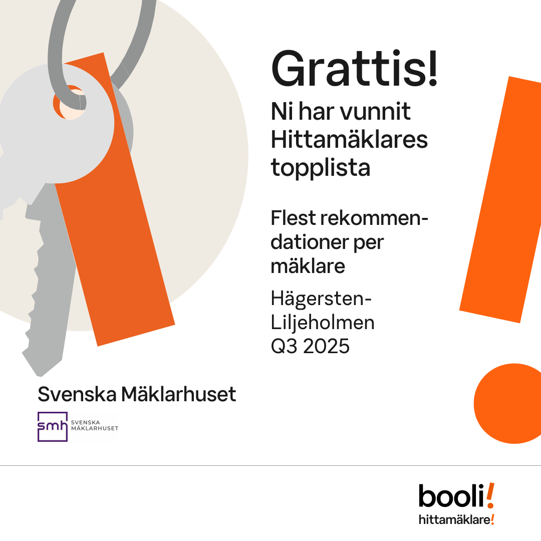 Statistik för publicerade bostäder, försäljningar och omdömen baseras på data från Booli och Hittamäklare. Statistiken för försäljningar avser inrapporterade och verifierade slutpriser från mäklare eller av Booli inhämtade och verifierade slutpriser. Statistiken för publicerade bostäder baseras på information som publicerats på Booli.se. Statistik för omdömen och rekommendationer baseras på omdömen från säljare som lämnats via Booli och Hittamäklare.