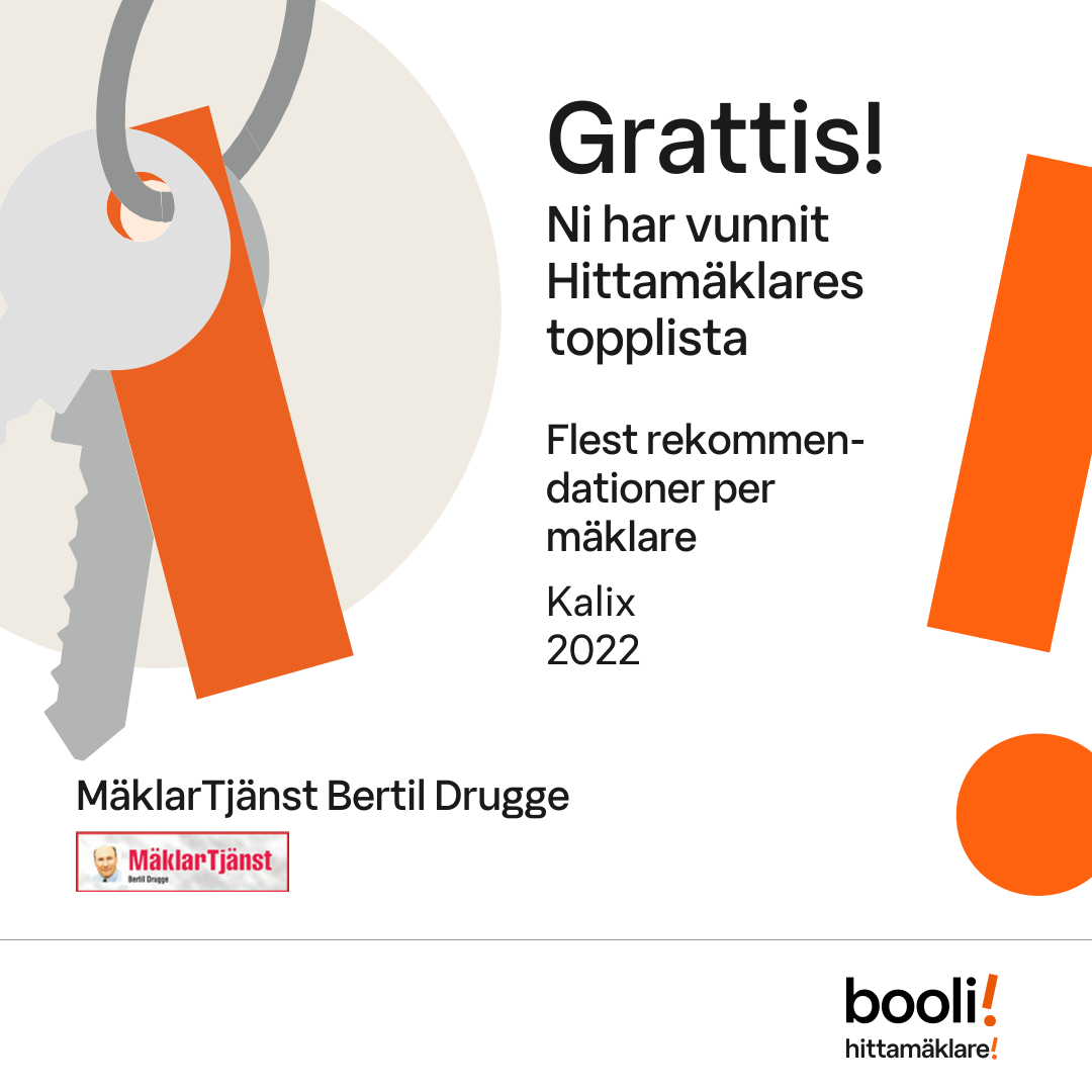 Statistik för publicerade bostäder, försäljningar och omdömen baseras på data från Booli och Hittamäklare. Statistiken för försäljningar avser inrapporterade och verifierade slutpriser från mäklare eller av Booli inhämtade och verifierade slutpriser. Statistiken för publicerade bostäder baseras på information som publicerats på Booli.se. Statistik för omdömen och rekommendationer baseras på omdömen från säljare som lämnats via Booli och Hittamäklare.