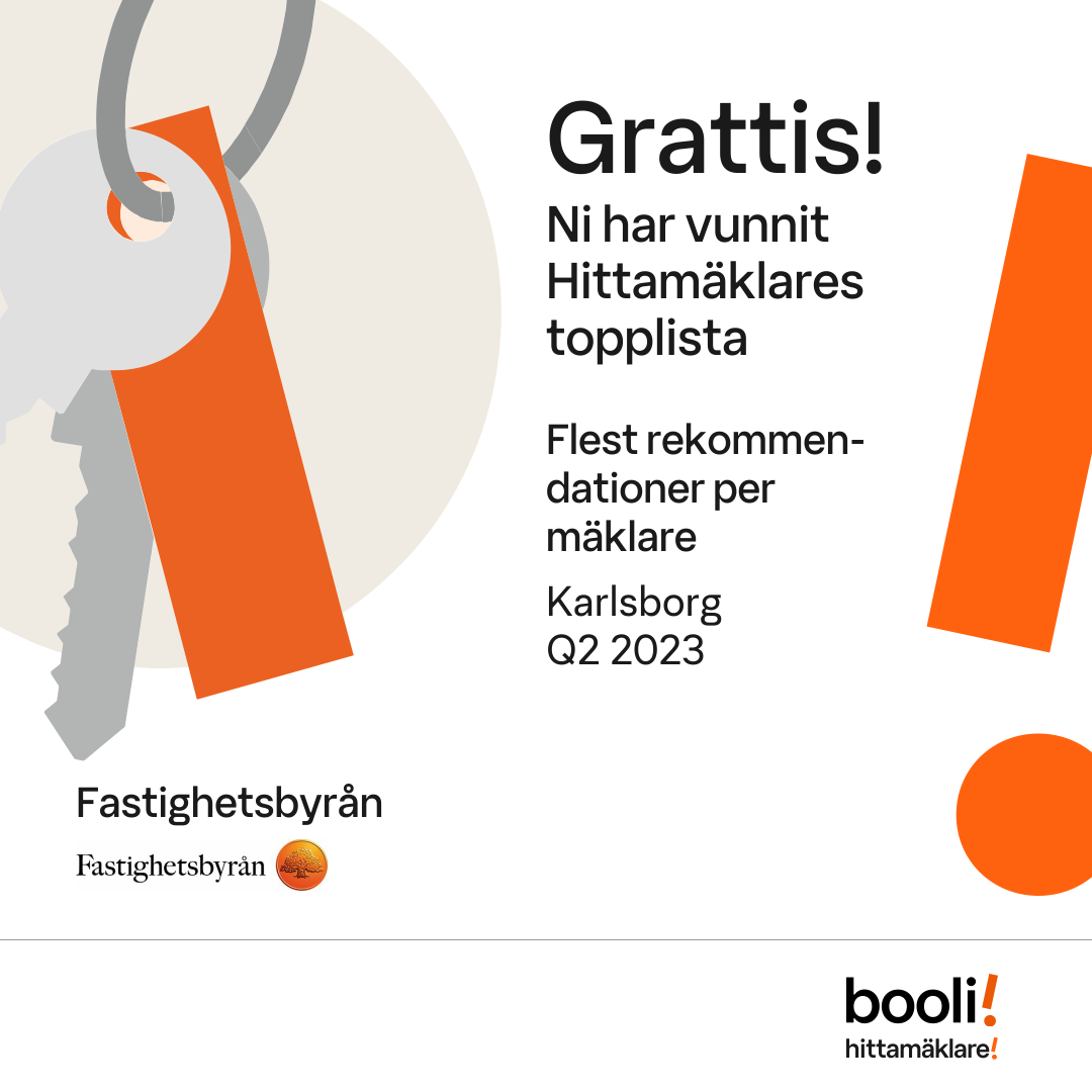 Statistik för publicerade bostäder, försäljningar och omdömen baseras på data från Booli och Hittamäklare. Statistiken för försäljningar avser inrapporterade och verifierade slutpriser från mäklare eller av Booli inhämtade och verifierade slutpriser. Statistiken för publicerade bostäder baseras på information som publicerats på Booli.se. Statistik för omdömen och rekommendationer baseras på omdömen från säljare som lämnats via Booli och Hittamäklare.