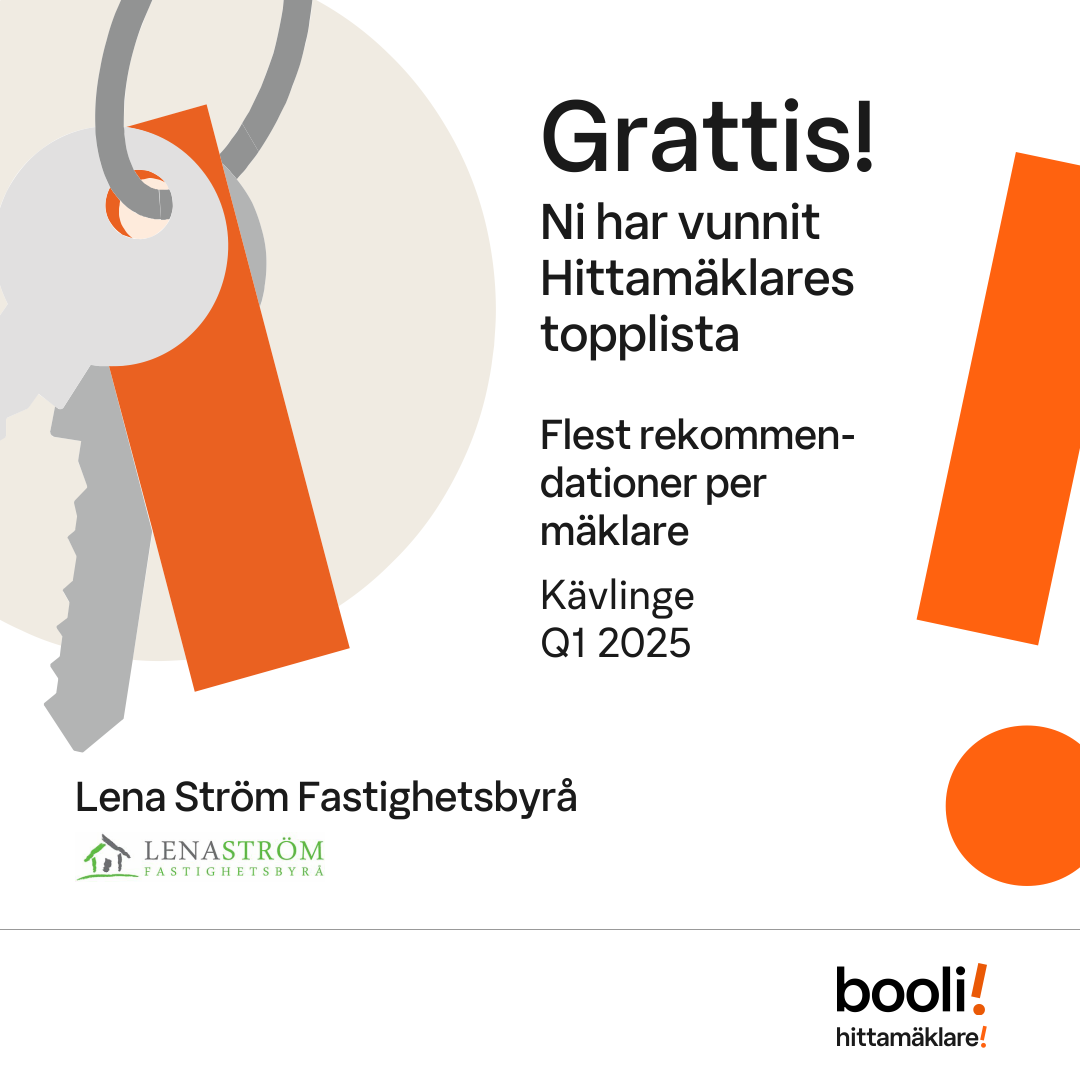 Statistik för publicerade bostäder, försäljningar och omdömen baseras på data från Booli och Hittamäklare. Statistiken för försäljningar avser inrapporterade och verifierade slutpriser från mäklare eller av Booli inhämtade och verifierade slutpriser. Statistiken för publicerade bostäder baseras på information som publicerats på Booli.se. Statistik för omdömen och rekommendationer baseras på omdömen från säljare som lämnats via Booli och Hittamäklare.