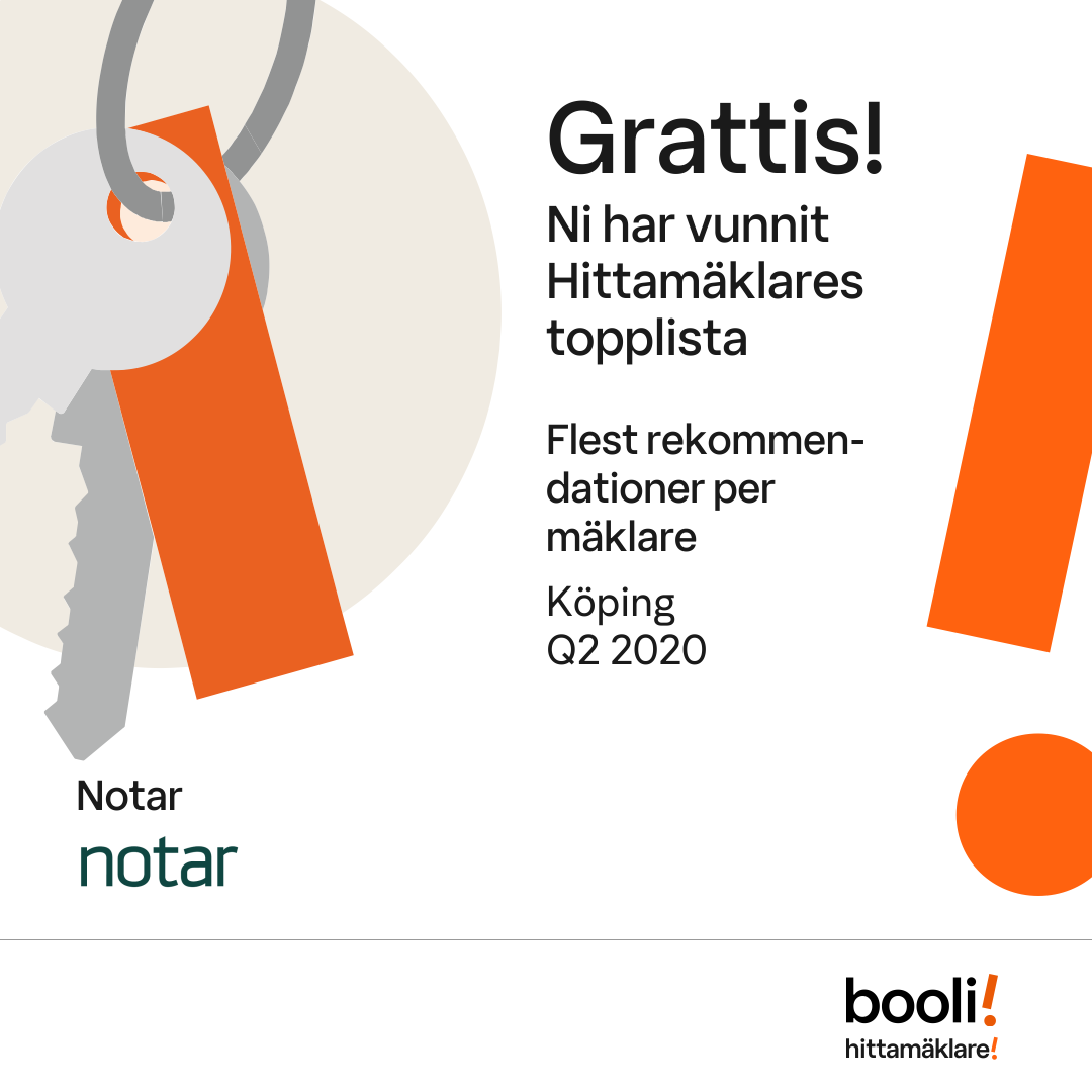 Statistik för publicerade bostäder, försäljningar och omdömen baseras på data från Booli och Hittamäklare. Statistiken för försäljningar avser inrapporterade och verifierade slutpriser från mäklare eller av Booli inhämtade och verifierade slutpriser. Statistiken för publicerade bostäder baseras på information som publicerats på Booli.se. Statistik för omdömen och rekommendationer baseras på omdömen från säljare som lämnats via Booli och Hittamäklare.