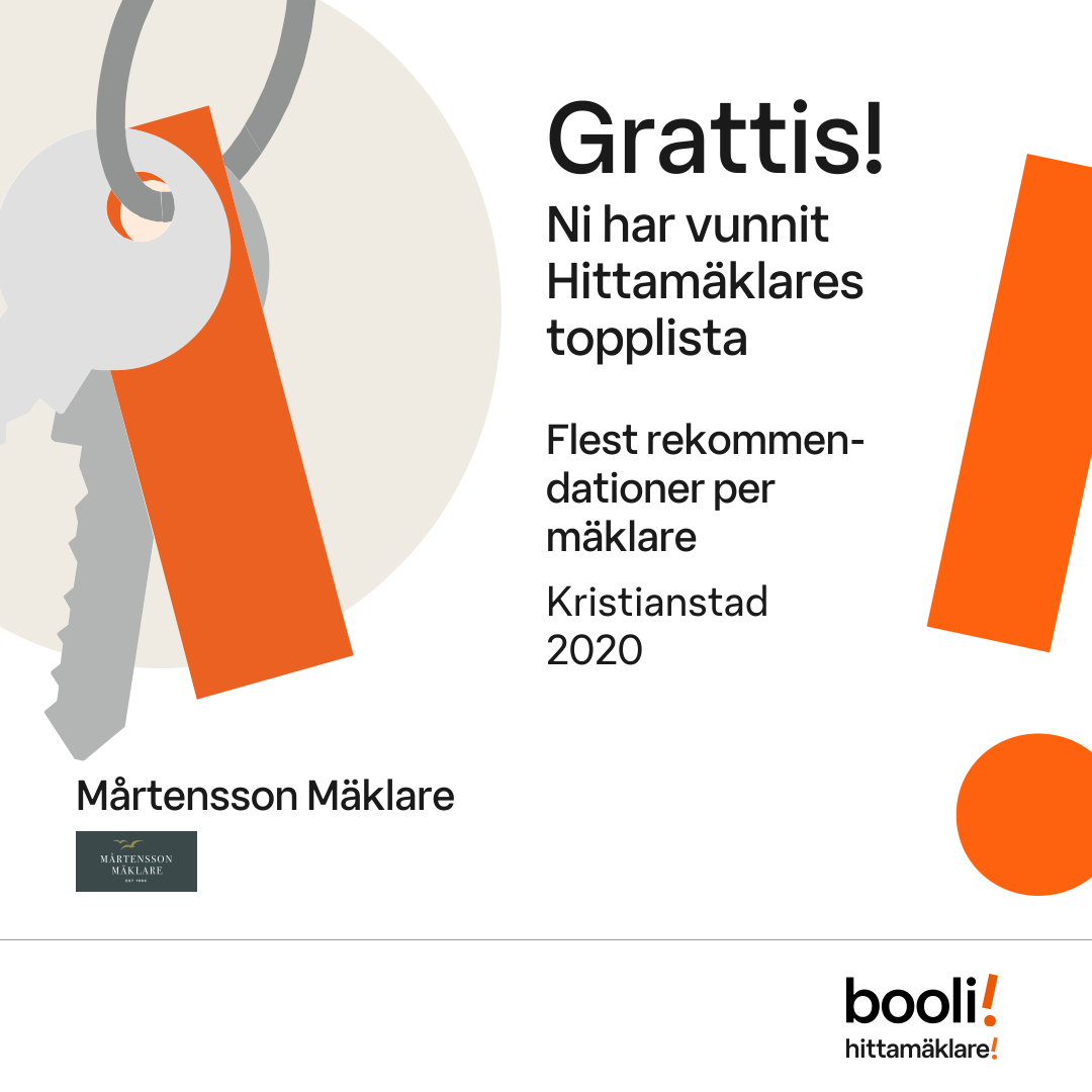 Statistik för publicerade bostäder, försäljningar och omdömen baseras på data från Booli och Hittamäklare. Statistiken för försäljningar avser inrapporterade och verifierade slutpriser från mäklare eller av Booli inhämtade och verifierade slutpriser. Statistiken för publicerade bostäder baseras på information som publicerats på Booli.se. Statistik för omdömen och rekommendationer baseras på omdömen från säljare som lämnats via Booli och Hittamäklare.