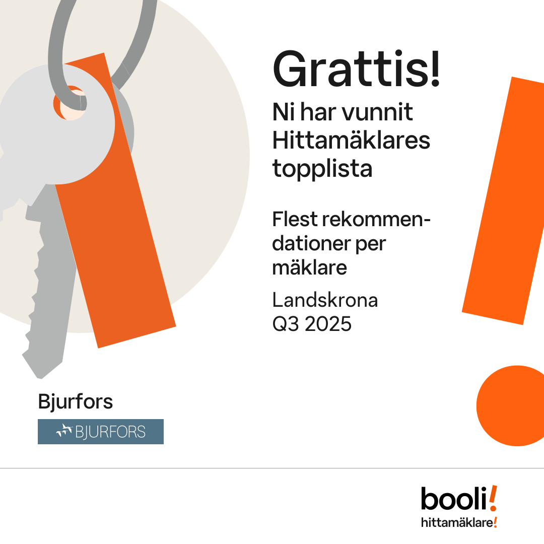 Statistik för publicerade bostäder, försäljningar och omdömen baseras på data från Booli och Hittamäklare. Statistiken för försäljningar avser inrapporterade och verifierade slutpriser från mäklare eller av Booli inhämtade och verifierade slutpriser. Statistiken för publicerade bostäder baseras på information som publicerats på Booli.se. Statistik för omdömen och rekommendationer baseras på omdömen från säljare som lämnats via Booli och Hittamäklare.