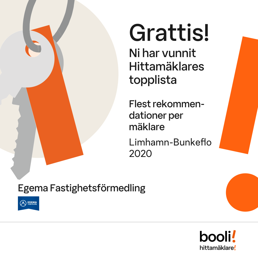 Statistik för publicerade bostäder, försäljningar och omdömen baseras på data från Booli. Statistiken för försäljningar avser inrapporterade och verifierade slutpriser från mäklare eller av Booli inhämtade och verifierade slutpriser. Statistiken för publicerade bostäder baseras på information som publicerats på Booli.se. Statistik för omdömen och rekommendationer baseras på omdömen från säljare som lämnats via Booli.