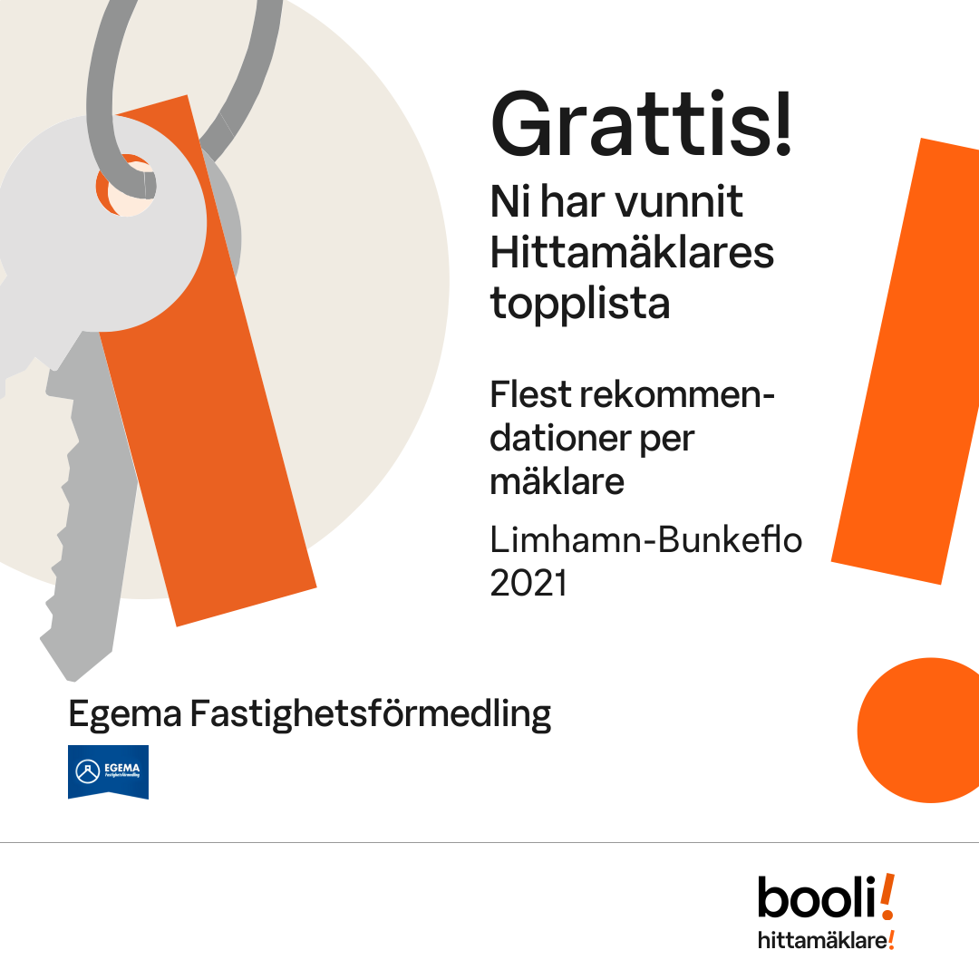 Statistik för publicerade bostäder, försäljningar och omdömen baseras på data från Booli och Hittamäklare. Statistiken för försäljningar avser inrapporterade och verifierade slutpriser från mäklare eller av Booli inhämtade och verifierade slutpriser. Statistiken för publicerade bostäder baseras på information som publicerats på Booli.se. Statistik för omdömen och rekommendationer baseras på omdömen från säljare som lämnats via Booli och Hittamäklare.