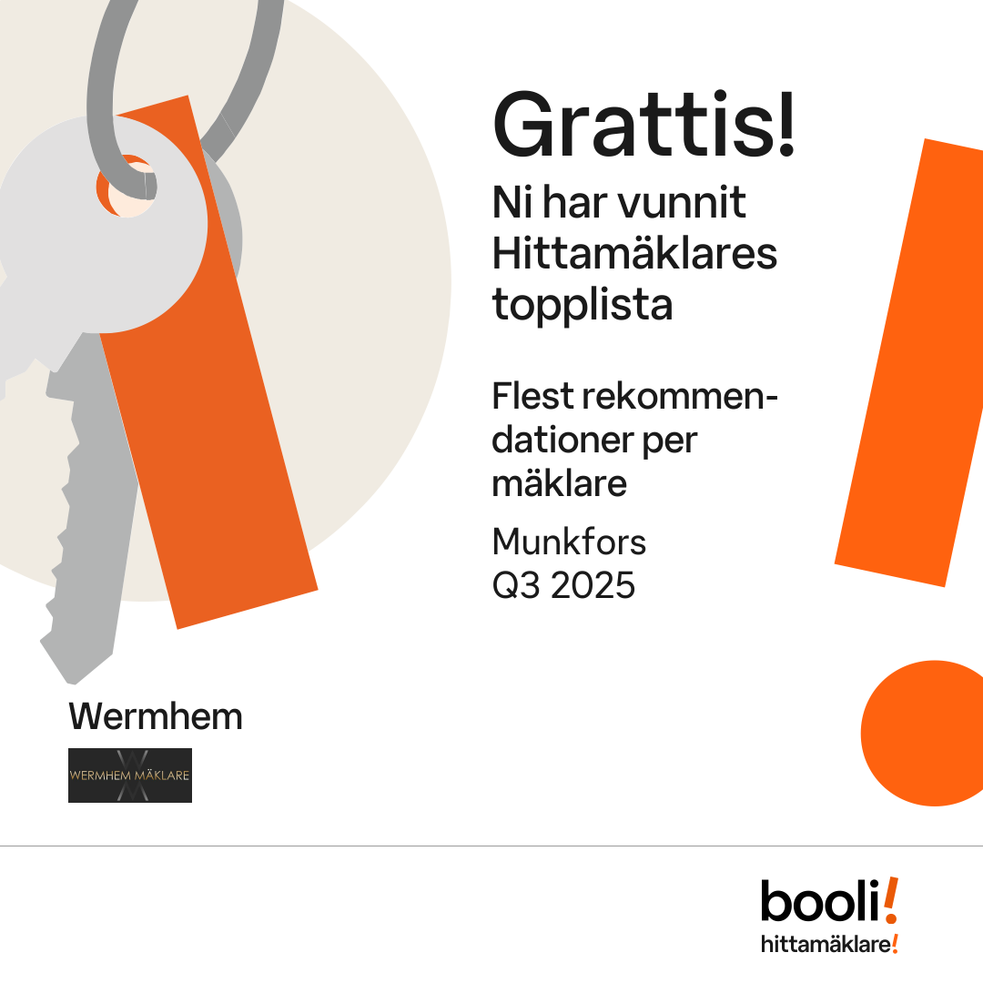 Statistik för publicerade bostäder, försäljningar och omdömen baseras på data från Booli och Hittamäklare. Statistiken för försäljningar avser inrapporterade och verifierade slutpriser från mäklare eller av Booli inhämtade och verifierade slutpriser. Statistiken för publicerade bostäder baseras på information som publicerats på Booli.se. Statistik för omdömen och rekommendationer baseras på omdömen från säljare som lämnats via Booli och Hittamäklare.