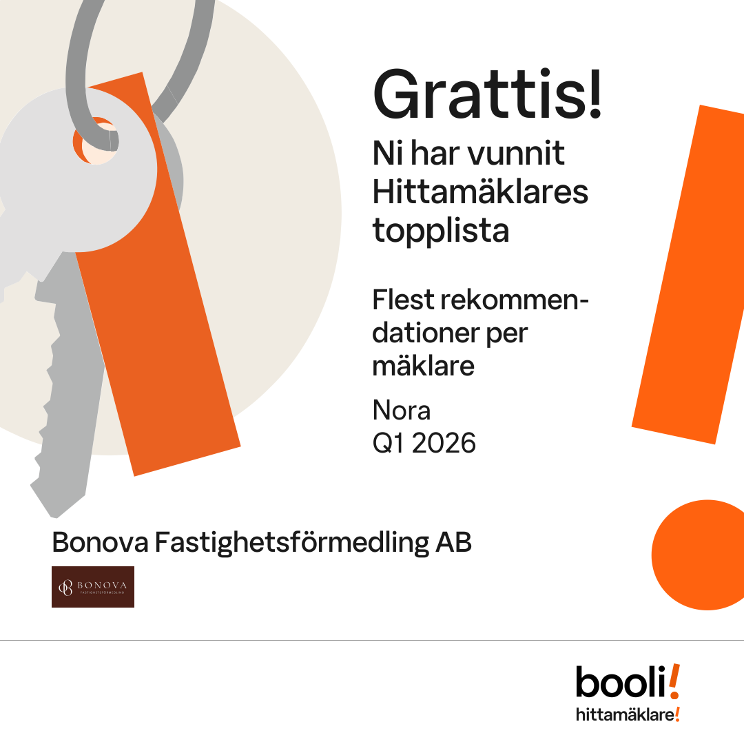 Statistik för publicerade bostäder, försäljningar och omdömen baseras på data från Booli. Statistiken för försäljningar avser inrapporterade och verifierade slutpriser från mäklare eller av Booli inhämtade och verifierade slutpriser. Statistiken för publicerade bostäder baseras på information som publicerats på Booli.se. Statistik för omdömen och rekommendationer baseras på omdömen från säljare som lämnats via Booli.