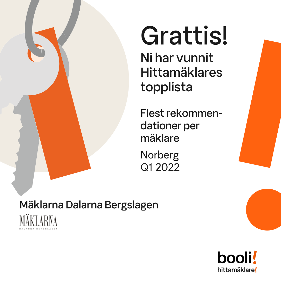 Statistik för publicerade bostäder, försäljningar och omdömen baseras på data från Booli och Hittamäklare. Statistiken för försäljningar avser inrapporterade och verifierade slutpriser från mäklare eller av Booli inhämtade och verifierade slutpriser. Statistiken för publicerade bostäder baseras på information som publicerats på Booli.se. Statistik för omdömen och rekommendationer baseras på omdömen från säljare som lämnats via Booli och Hittamäklare.