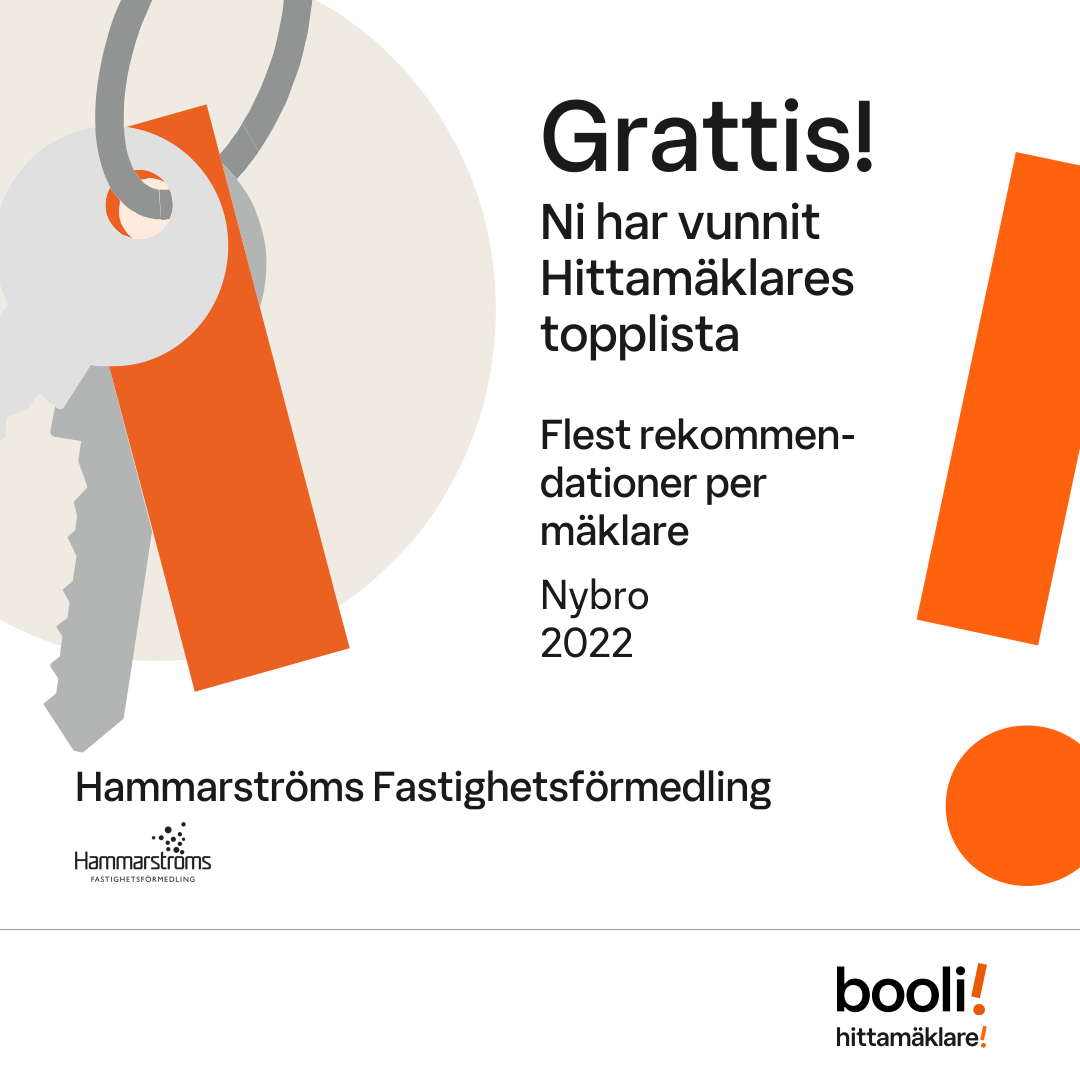 Statistik för publicerade bostäder, försäljningar och omdömen baseras på data från Booli. Statistiken för försäljningar avser inrapporterade och verifierade slutpriser från mäklare eller av Booli inhämtade och verifierade slutpriser. Statistiken för publicerade bostäder baseras på information som publicerats på Booli.se. Statistik för omdömen och rekommendationer baseras på omdömen från säljare som lämnats via Booli.