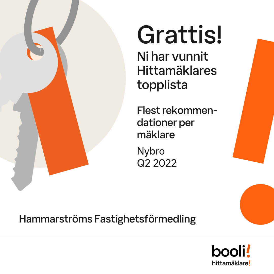 Statistik för publicerade bostäder, försäljningar och omdömen baseras på data från Booli och Hittamäklare. Statistiken för försäljningar avser inrapporterade och verifierade slutpriser från mäklare eller av Booli inhämtade och verifierade slutpriser. Statistiken för publicerade bostäder baseras på information som publicerats på Booli.se. Statistik för omdömen och rekommendationer baseras på omdömen från säljare som lämnats via Booli och Hittamäklare.