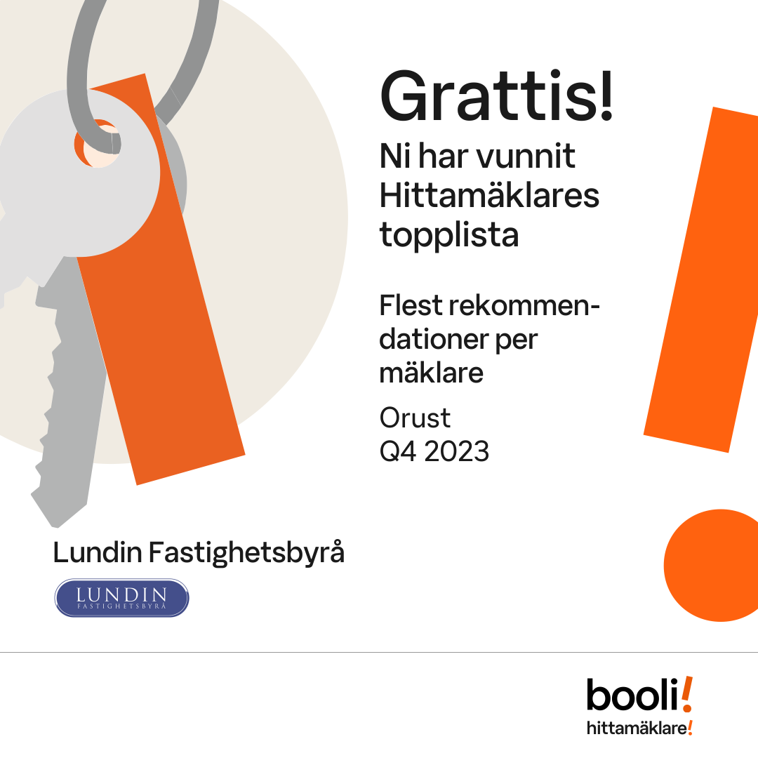 Statistik för publicerade bostäder, försäljningar och omdömen baseras på data från Booli och Hittamäklare. Statistiken för försäljningar avser inrapporterade och verifierade slutpriser från mäklare eller av Booli inhämtade och verifierade slutpriser. Statistiken för publicerade bostäder baseras på information som publicerats på Booli.se. Statistik för omdömen och rekommendationer baseras på omdömen från säljare som lämnats via Booli och Hittamäklare.